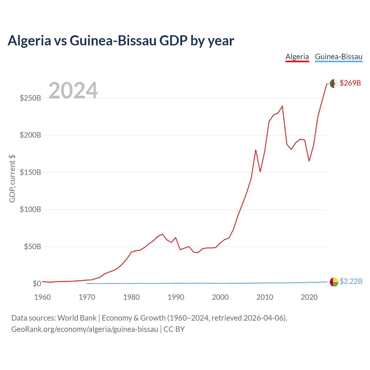 Algeria has a GDP of $269B compared to $2.22B for Guinea-Bissau, ranking 51/197 and 176/197 by economy size, respectively.