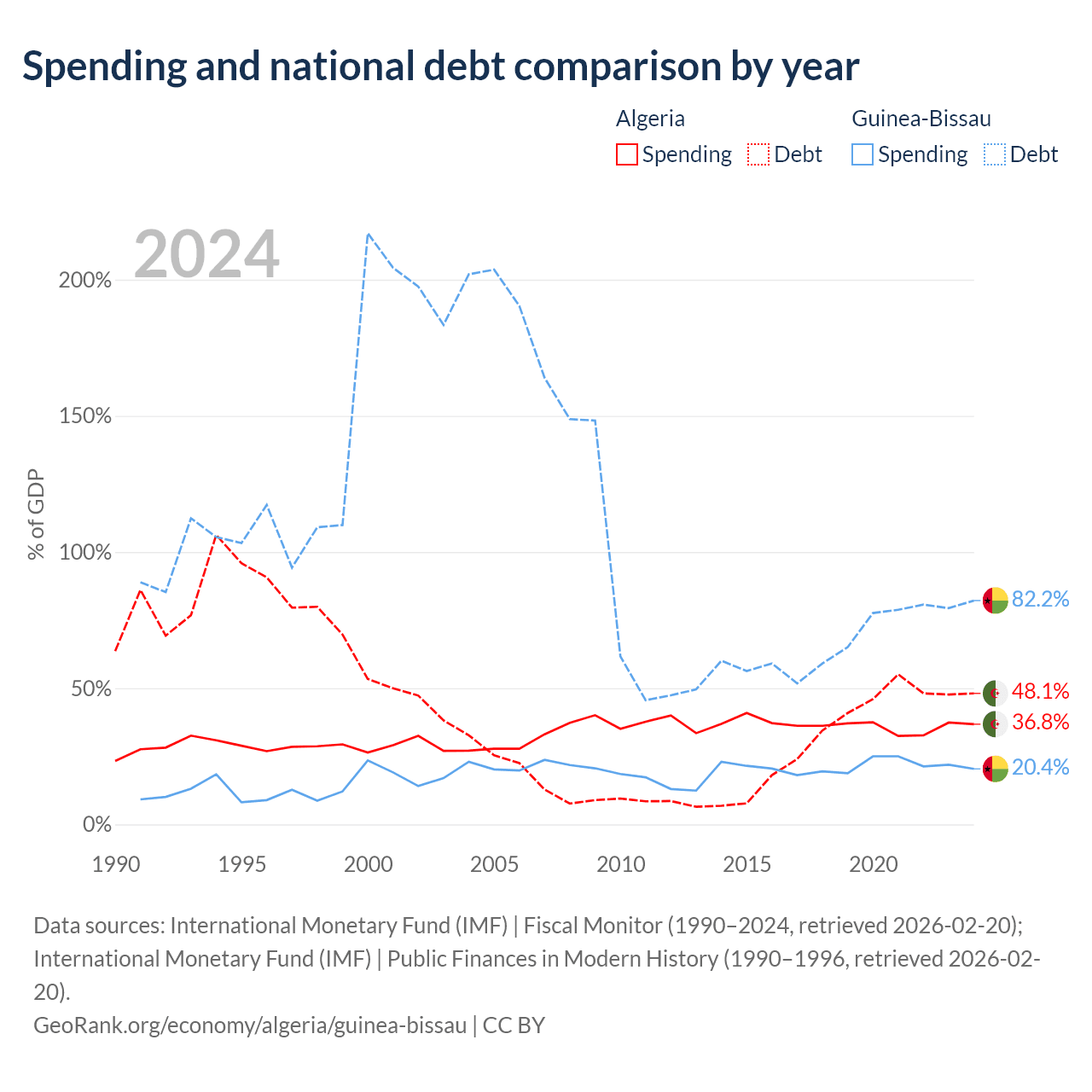 Algeria has $129B in government debt (48.1% of GDP), compared to $1.82B (82.2% of GDP) in Guinea-Bissau.
