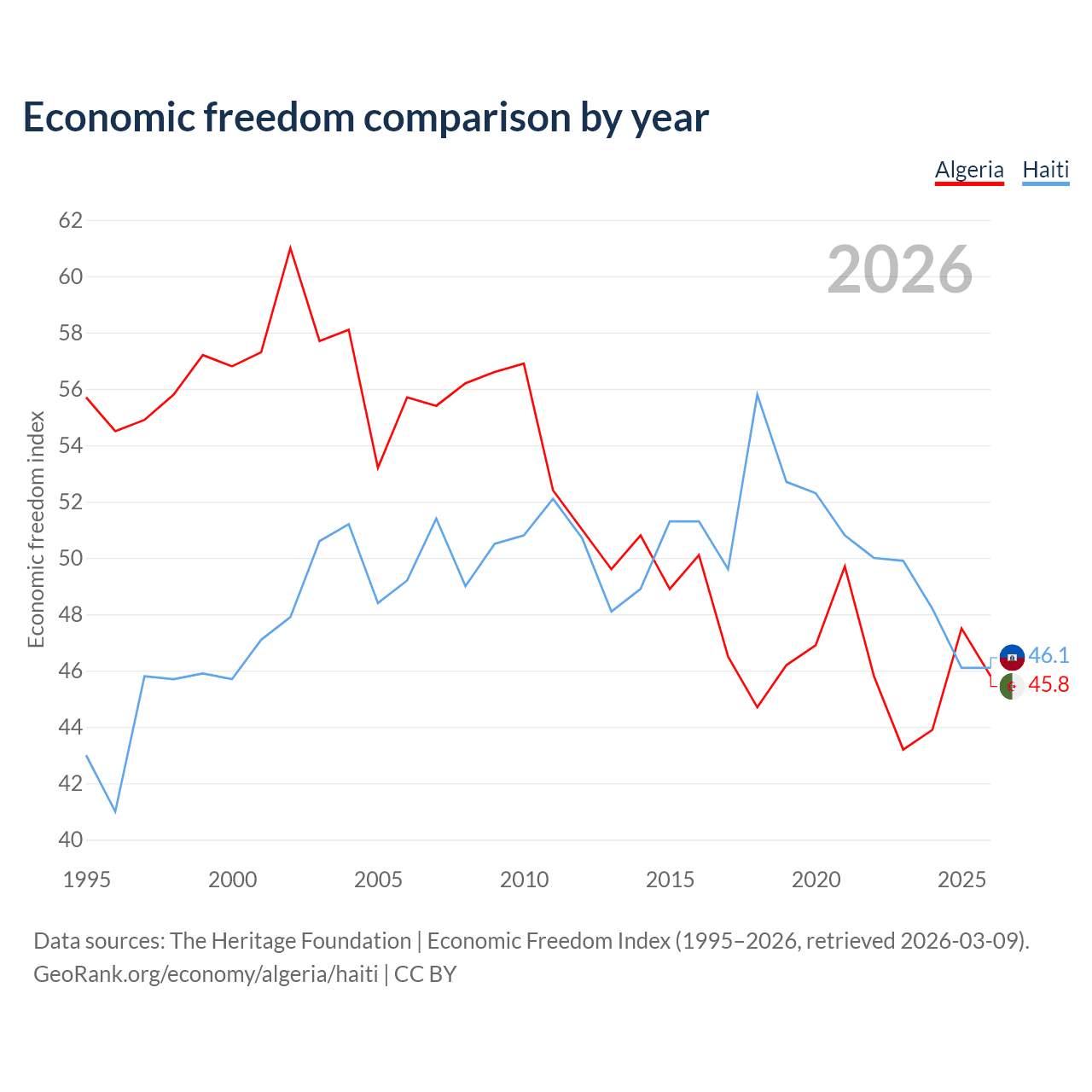 The Economic Freedom Index for Algeria is 45.8, ranking 179/197, compared to 46.1 for Haiti, ranking 178/197. The chart above displays a comparison of annual changes in economic freedom indexes.