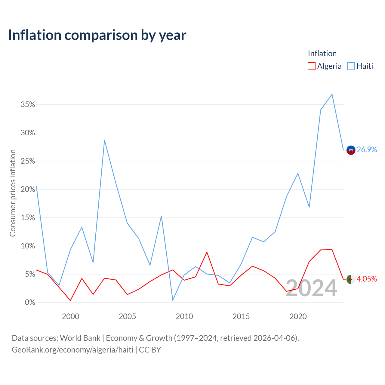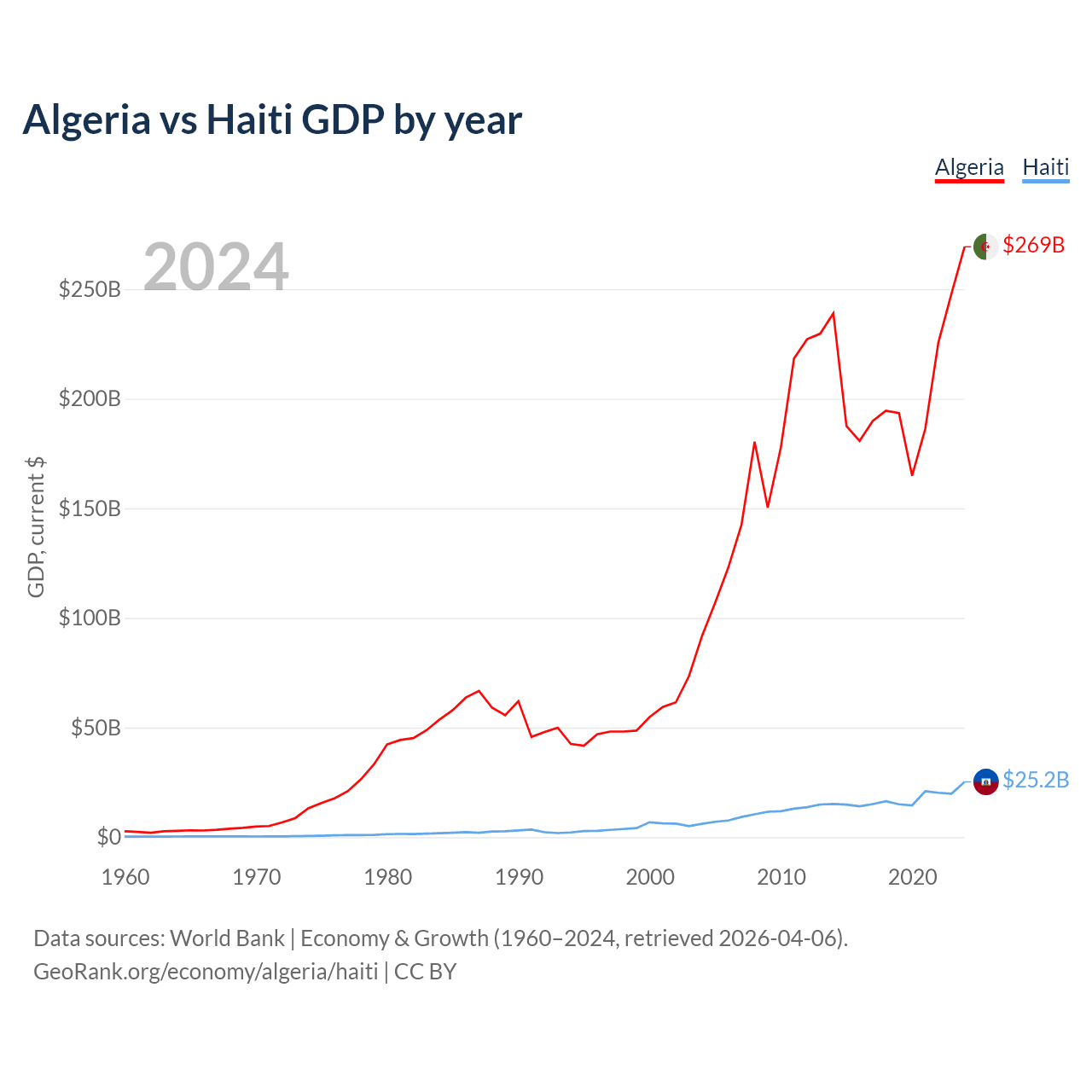 Algeria has a GDP of $269B compared to $25.2B for Haiti, ranking 51/197 and 117/197 by economy size, respectively.