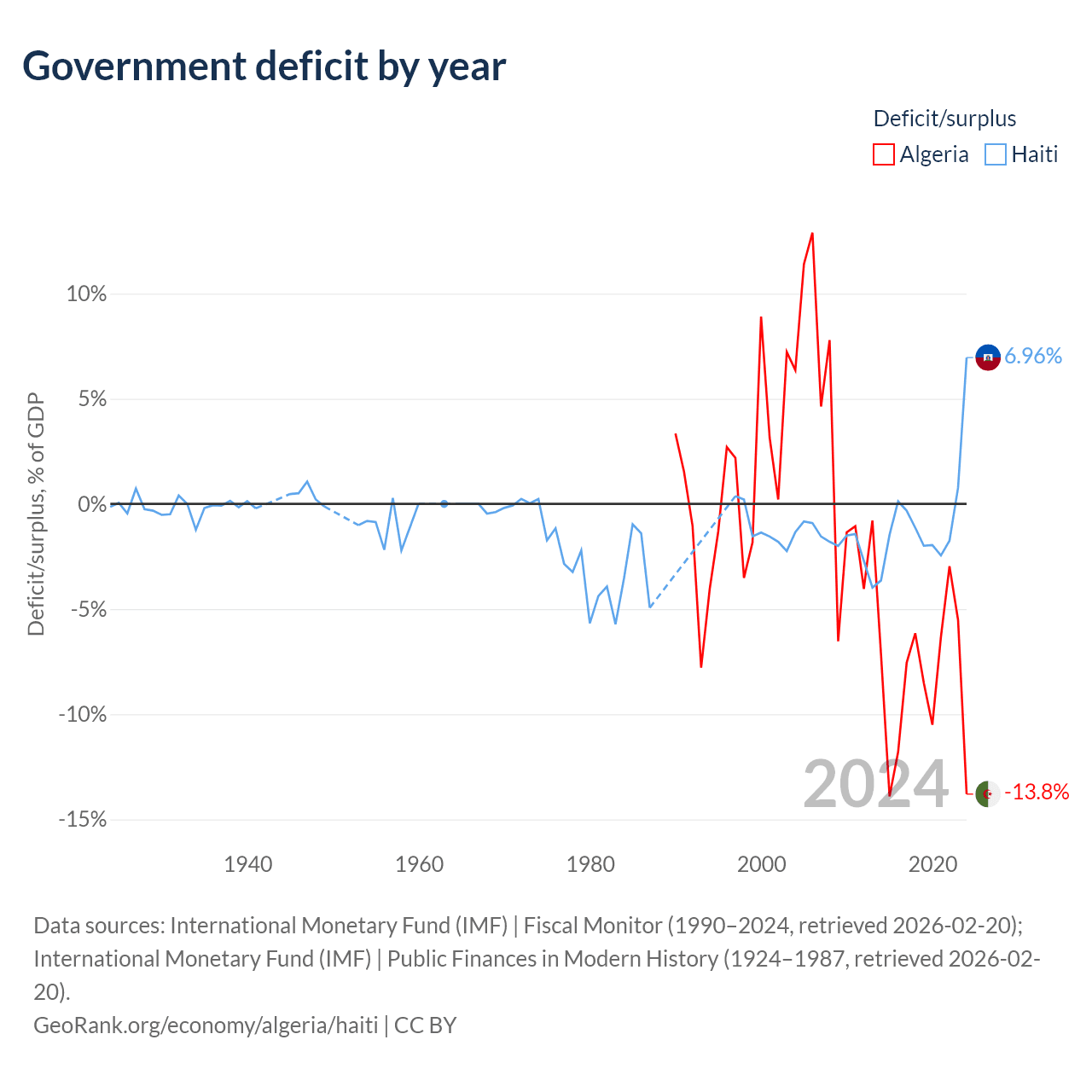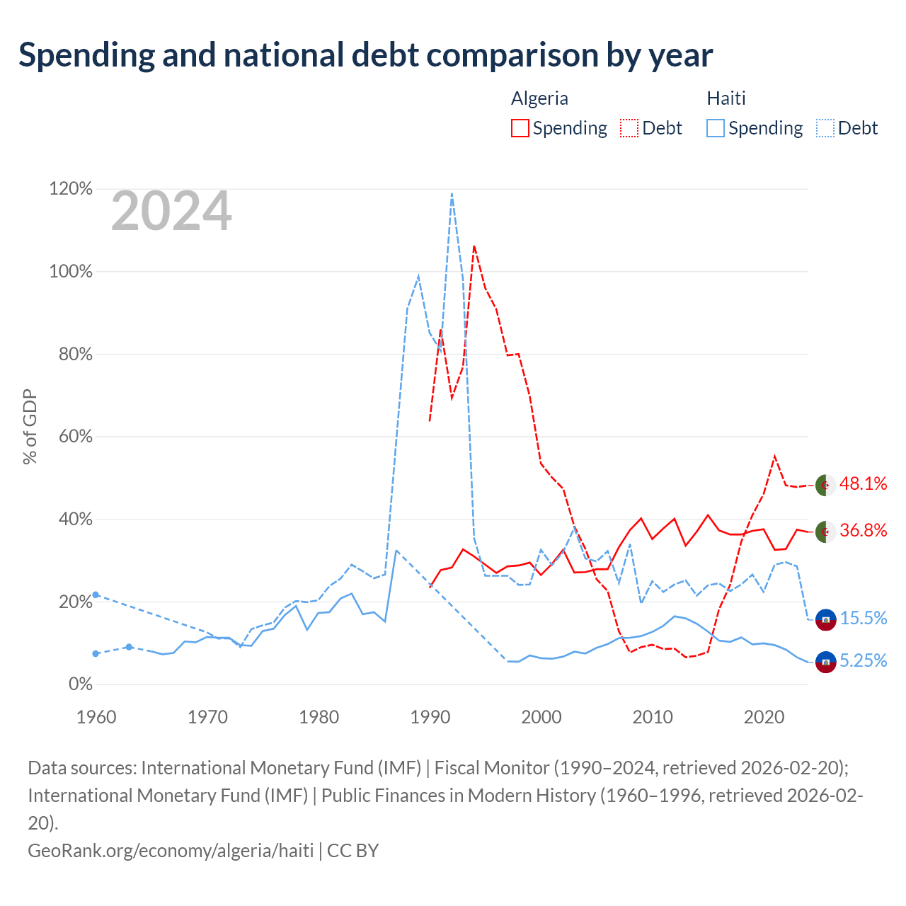 Algeria has $129B in government debt (48.1% of GDP), compared to $3.91B (15.5% of GDP) in Haiti.