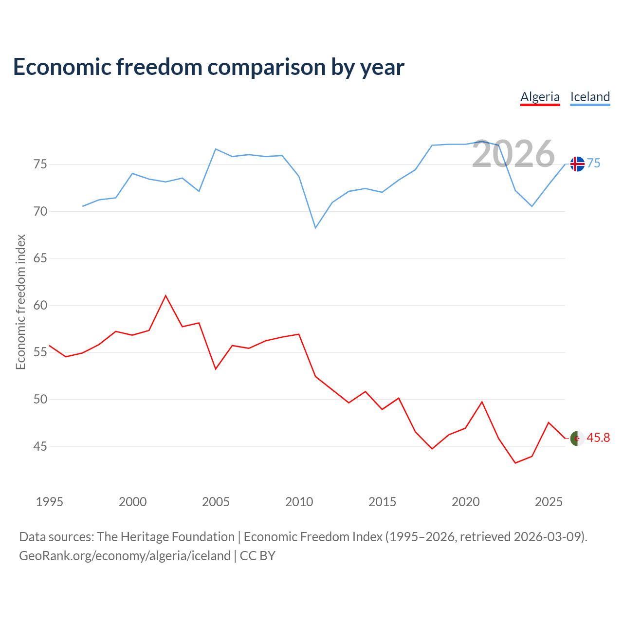 The Economic Freedom Index for Algeria is 45.8, ranking 179/197, compared to 75 for Iceland, ranking 19/197. The chart above displays a comparison of annual changes in economic freedom indexes.