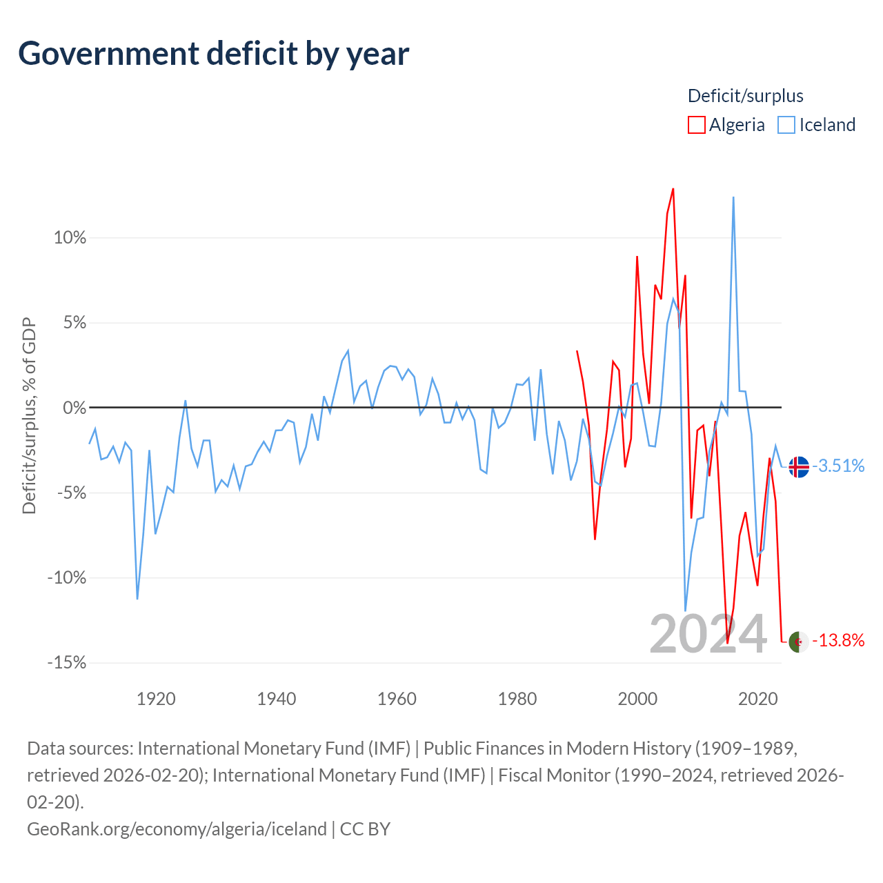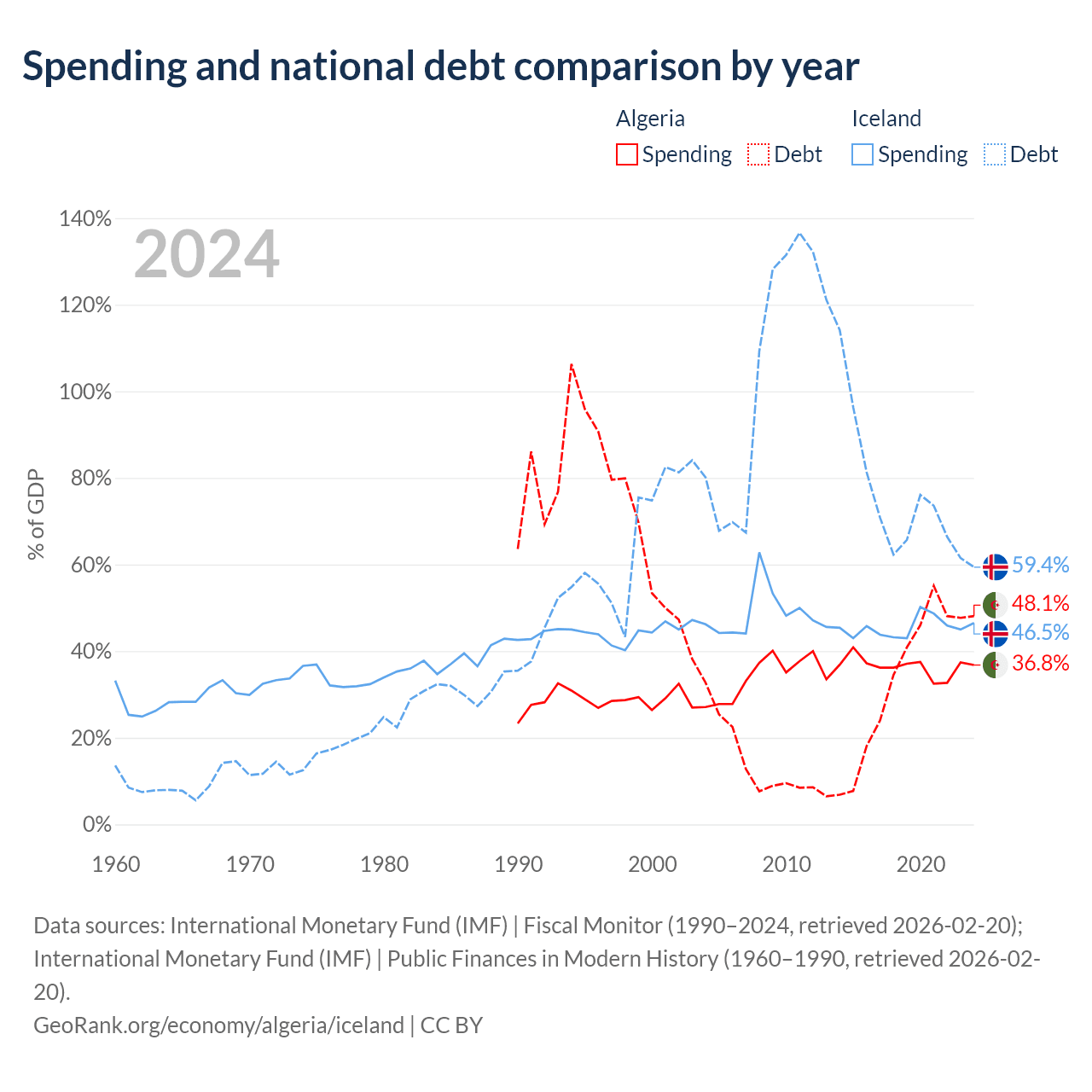 Algeria has $129B in government debt (48.1% of GDP), compared to $19.8B (59.4% of GDP) in Iceland.