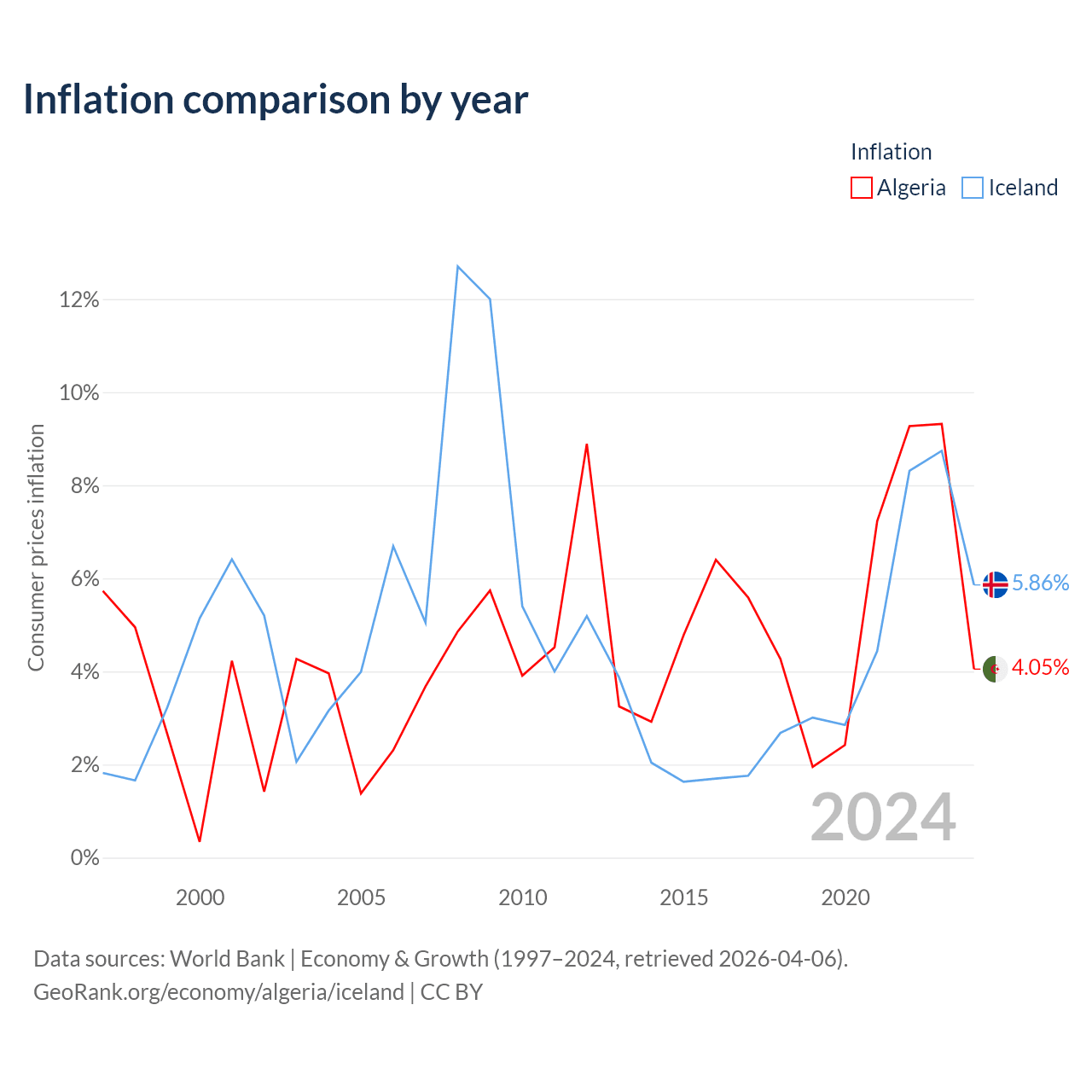 Algeria has a GDP of $269B compared to $33.3B for Iceland, ranking 51/197 and 108/197 by economy size, respectively.