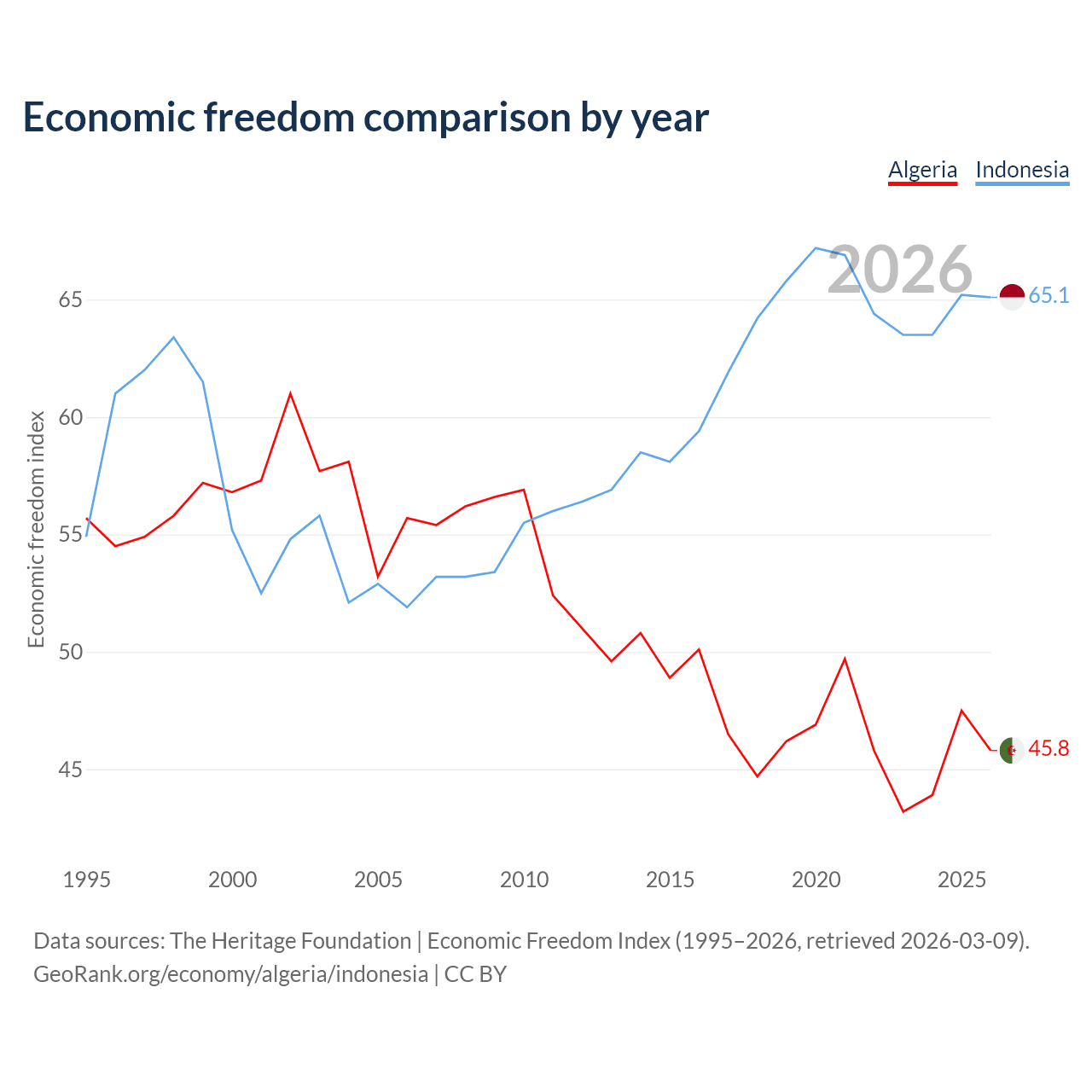 The Economic Freedom Index for Algeria is 45.8, ranking 179/197, compared to 65.1 for Indonesia, ranking 67/197. The chart above displays a comparison of annual changes in economic freedom indexes.
