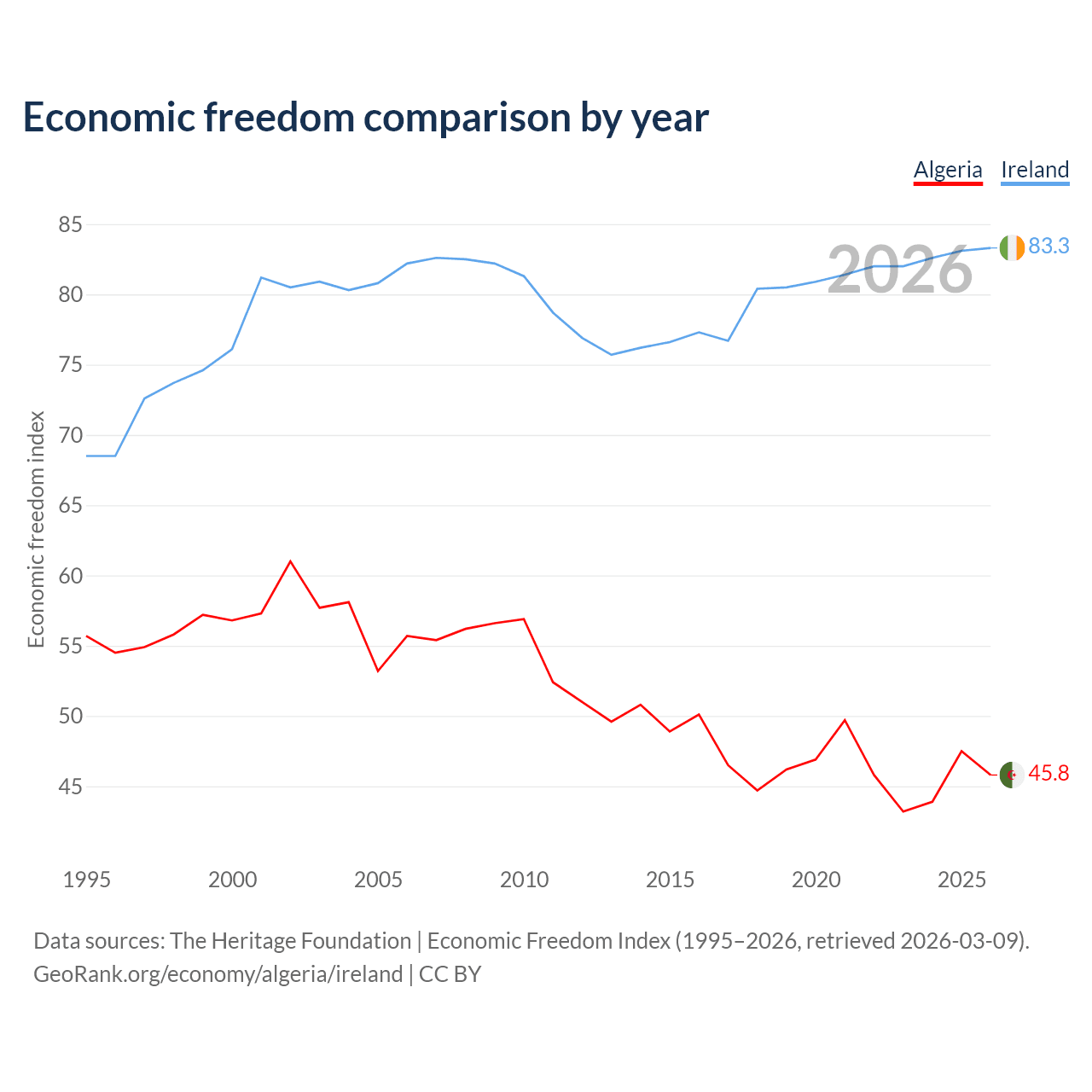 The Economic Freedom Index for Algeria is 45.8, ranking 179/197, compared to 83.3 for Ireland, ranking 3/197. The chart above displays a comparison of annual changes in economic freedom indexes.