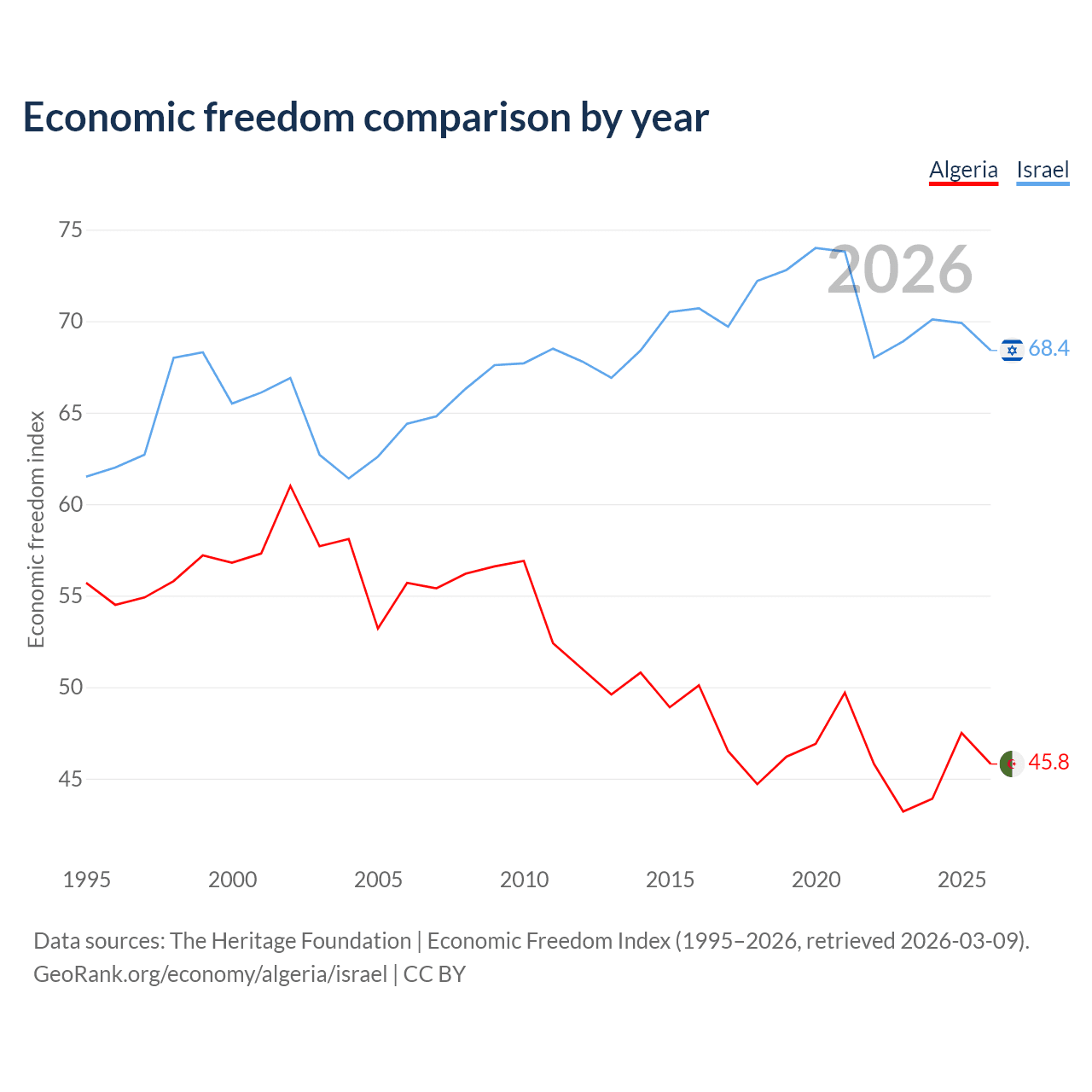 The Economic Freedom Index for Algeria is 45.8, ranking 179/197, compared to 68.4 for Israel, ranking 47/197. The chart above displays a comparison of annual changes in economic freedom indexes.