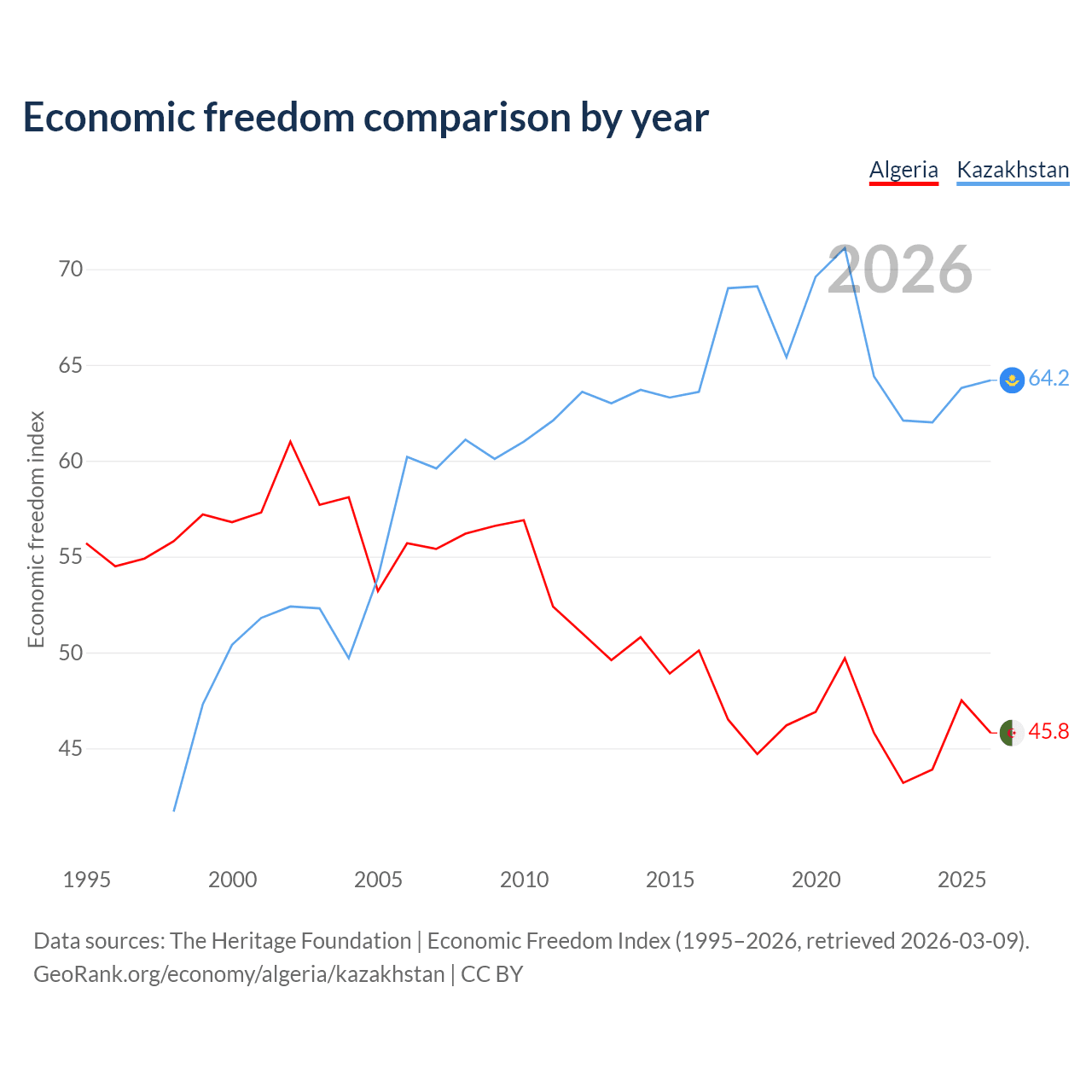 The Economic Freedom Index for Algeria is 45.8, ranking 179/197, compared to 64.2 for Kazakhstan, ranking 75/197. The chart above displays a comparison of annual changes in economic freedom indexes.
