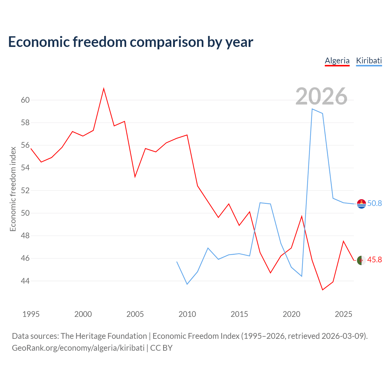 The Economic Freedom Index for Algeria is 45.8, ranking 179/197, compared to 50.8 for Kiribati, ranking 158/197. The chart above displays a comparison of annual changes in economic freedom indexes.