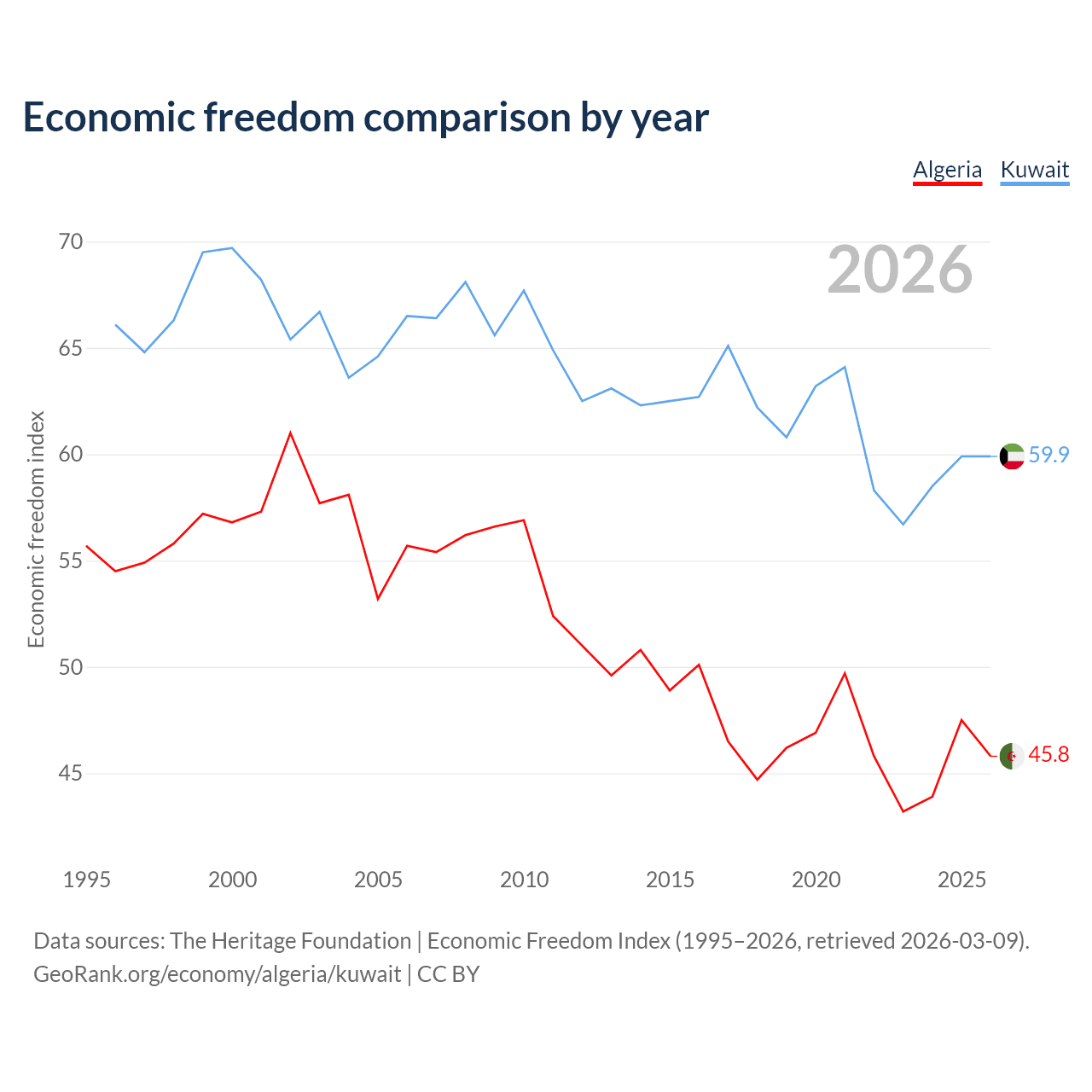 The Economic Freedom Index for Algeria is 45.8, ranking 179/197, compared to 59.9 for Kuwait, ranking 100/197. The chart above displays a comparison of annual changes in economic freedom indexes.