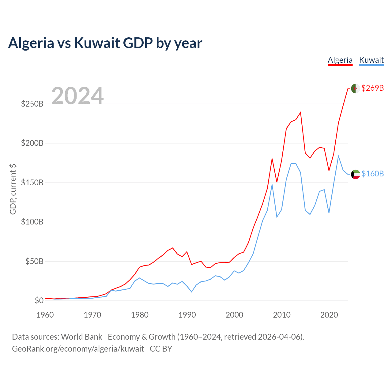 Algeria has a GDP of $269B compared to $160B for Kuwait, ranking 51/197 and 59/197 by economy size, respectively.