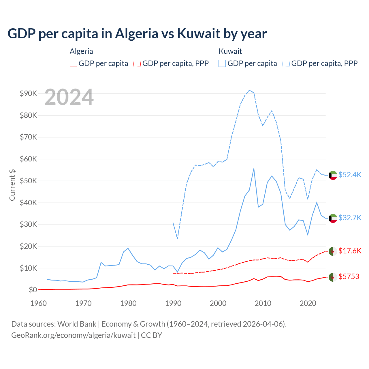 GDP per capita in Algeria vs Kuwait by year