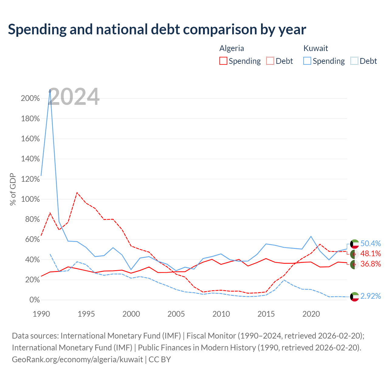 Algeria has $129B in government debt (48.1% of GDP), compared to $4.68B (2.92% of GDP) in Kuwait.