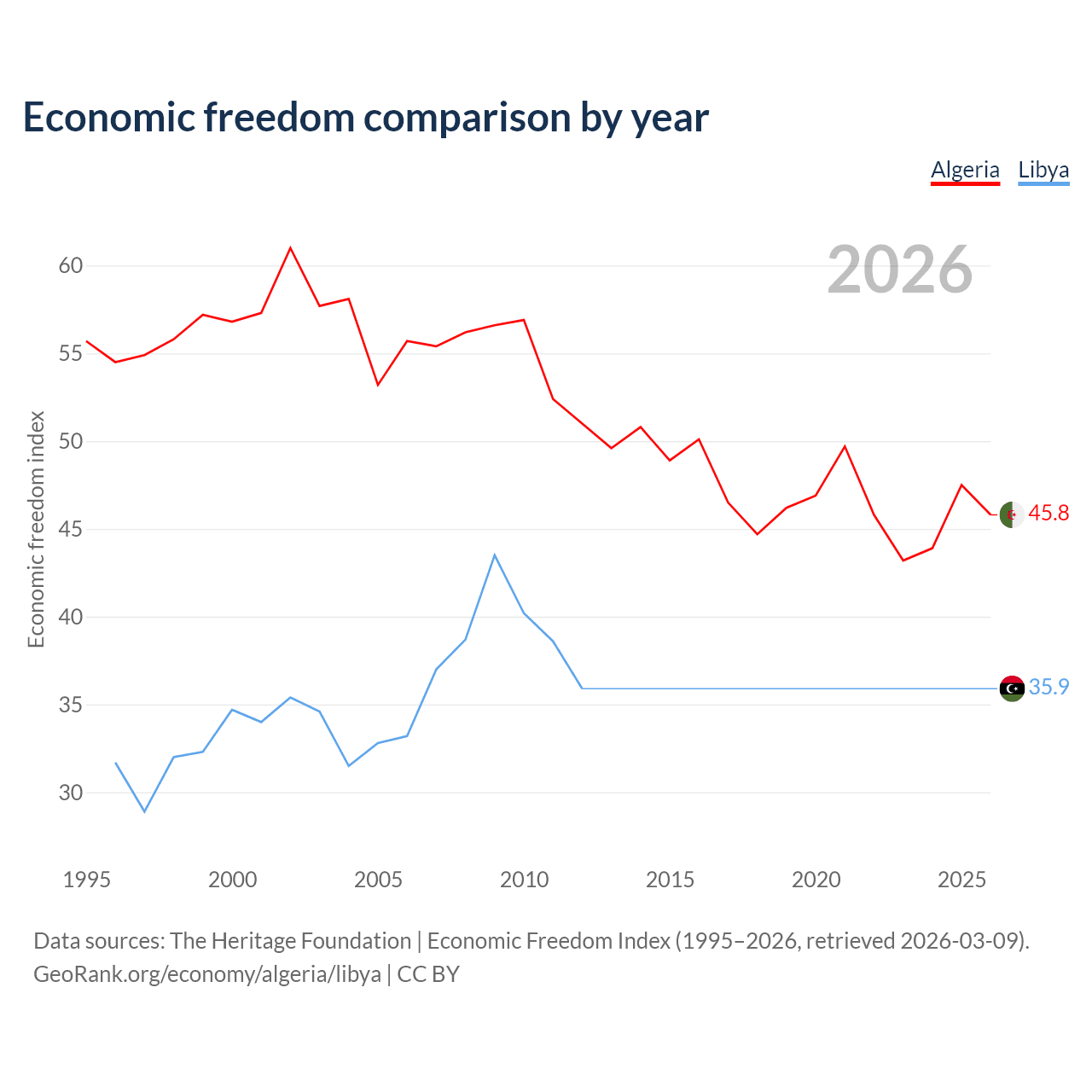 Data sources: The Heritage Foundation | Economic Freedom Index (1995–2026, retrieved 2026-03-09).