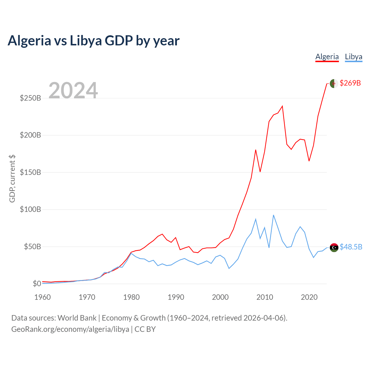 Algeria has a GDP of $269B compared to $48.5B for Libya, ranking 51/197 and 95/197 by economy size, respectively.