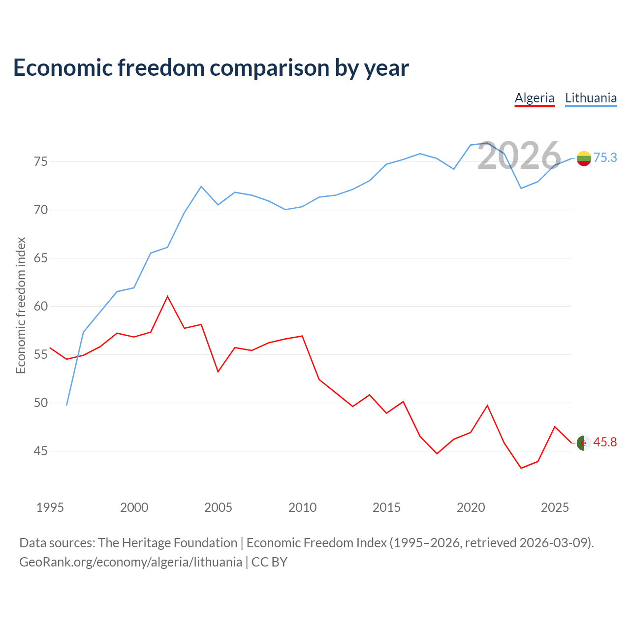 The Economic Freedom Index for Algeria is 45.8, ranking 179/197, compared to 75.3 for Lithuania, ranking 18/197. The chart above displays a comparison of annual changes in economic freedom indexes.