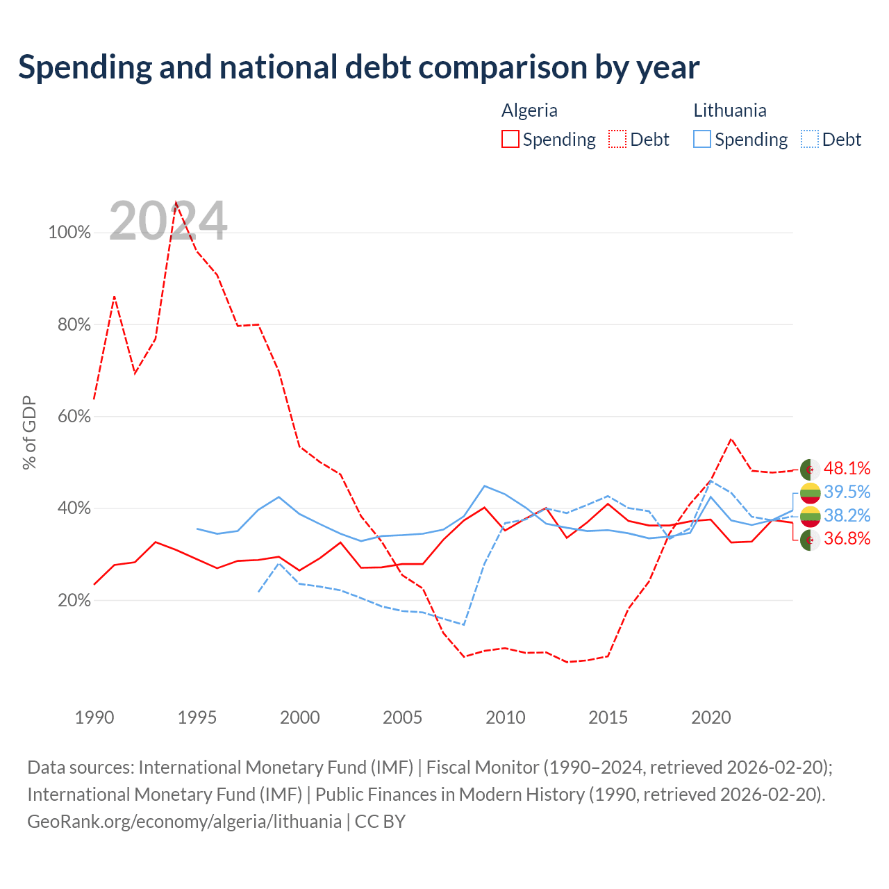 Algeria has $129B in government debt (48.1% of GDP), compared to $32.4B (38.2% of GDP) in Lithuania.