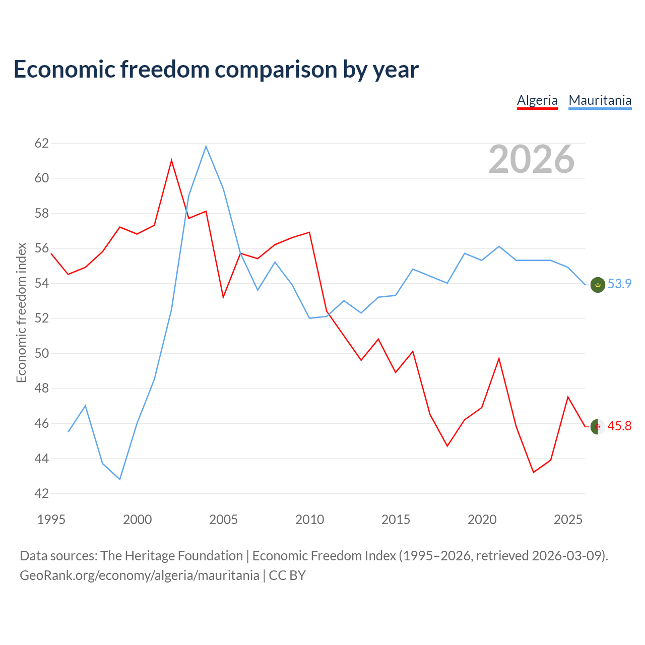 The Economic Freedom Index for Algeria is 45.8, ranking 179/197, compared to 53.9 for Mauritania, ranking 136/197. The chart above displays a comparison of annual changes in economic freedom indexes.