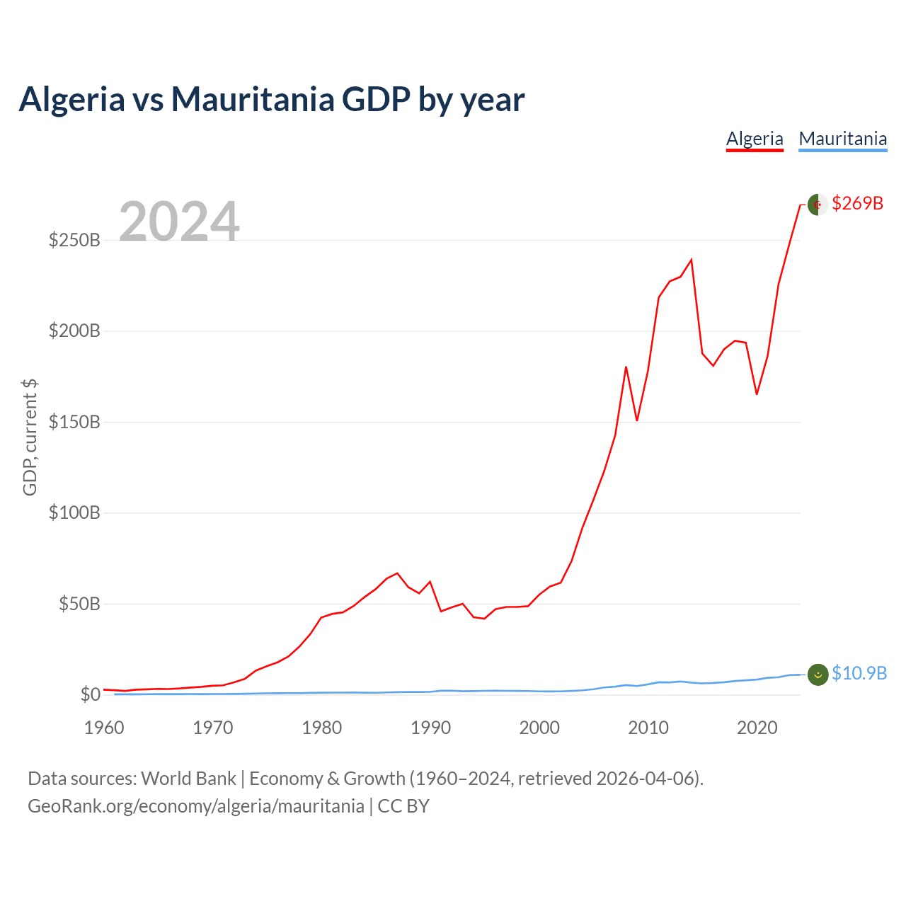 Algeria has a GDP of $269B compared to $10.9B for Mauritania, ranking 51/197 and 153/197 by economy size, respectively.