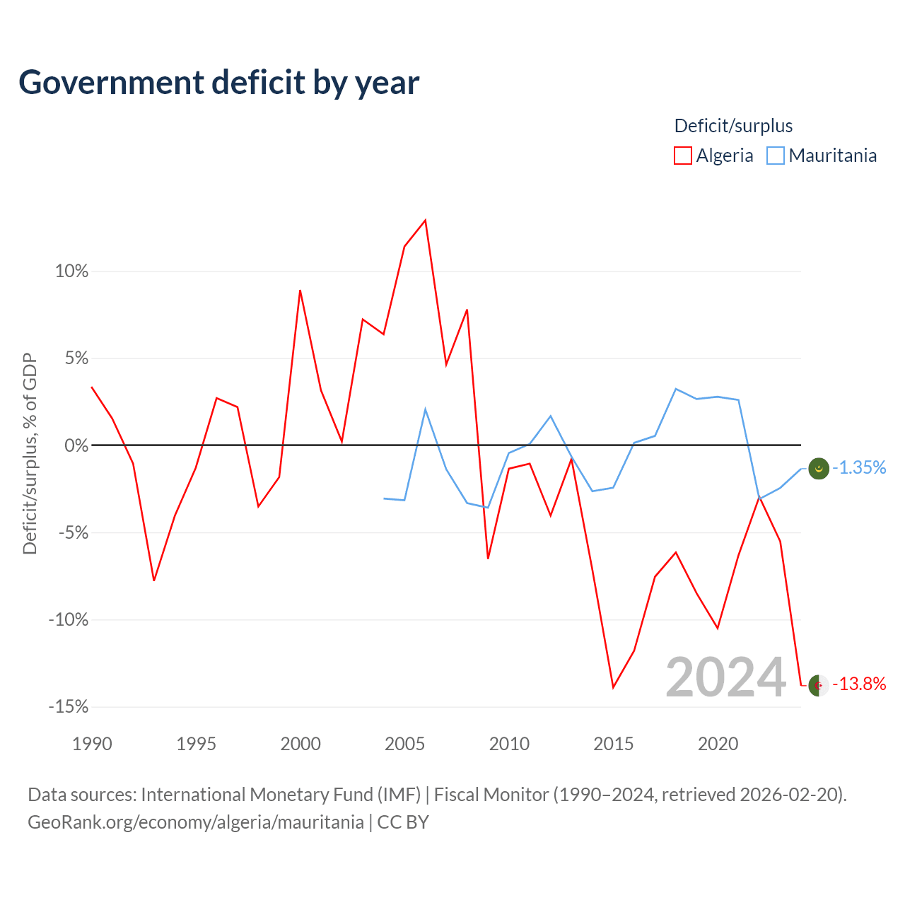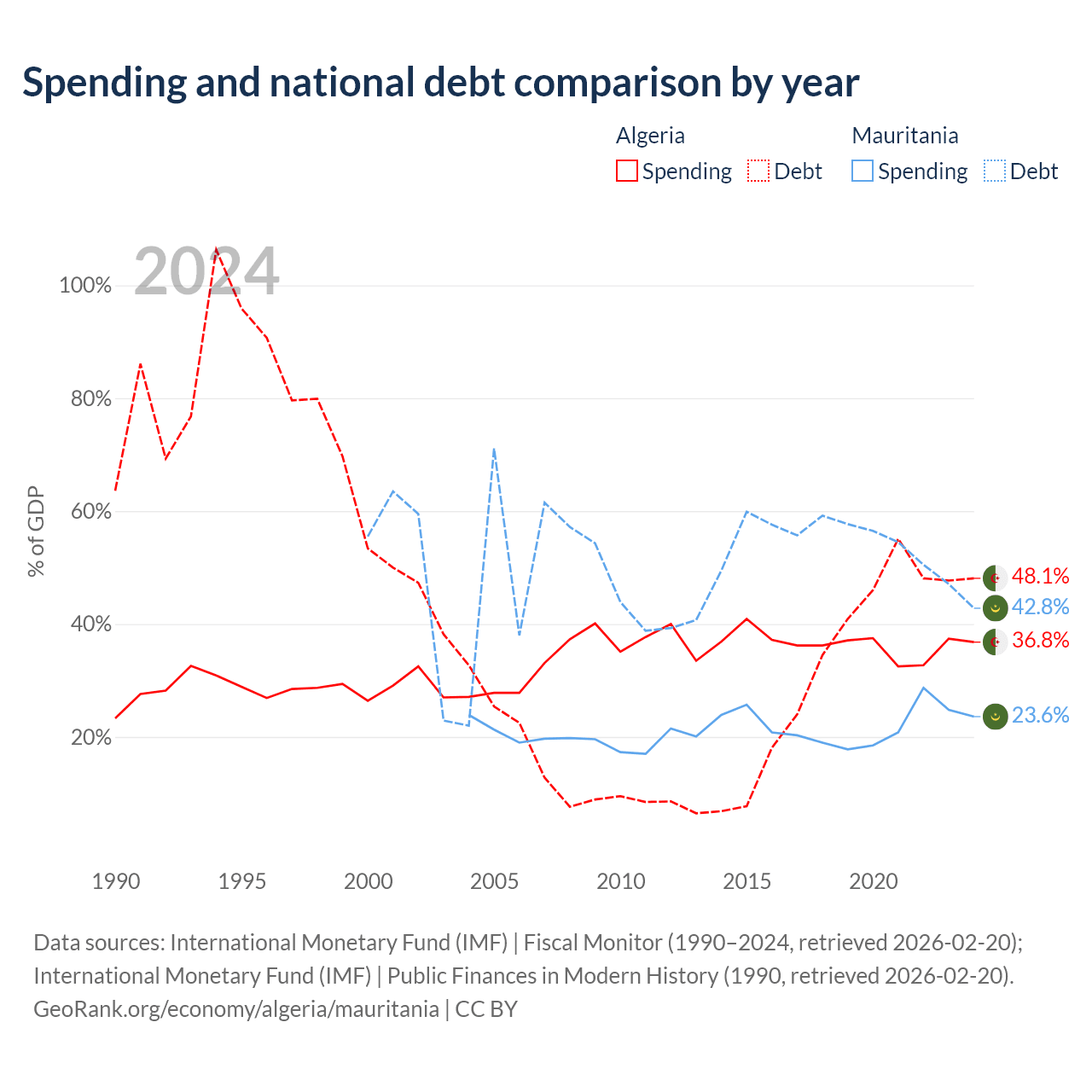 Algeria has $129B in government debt (48.1% of GDP), compared to $4.67B (42.8% of GDP) in Mauritania.