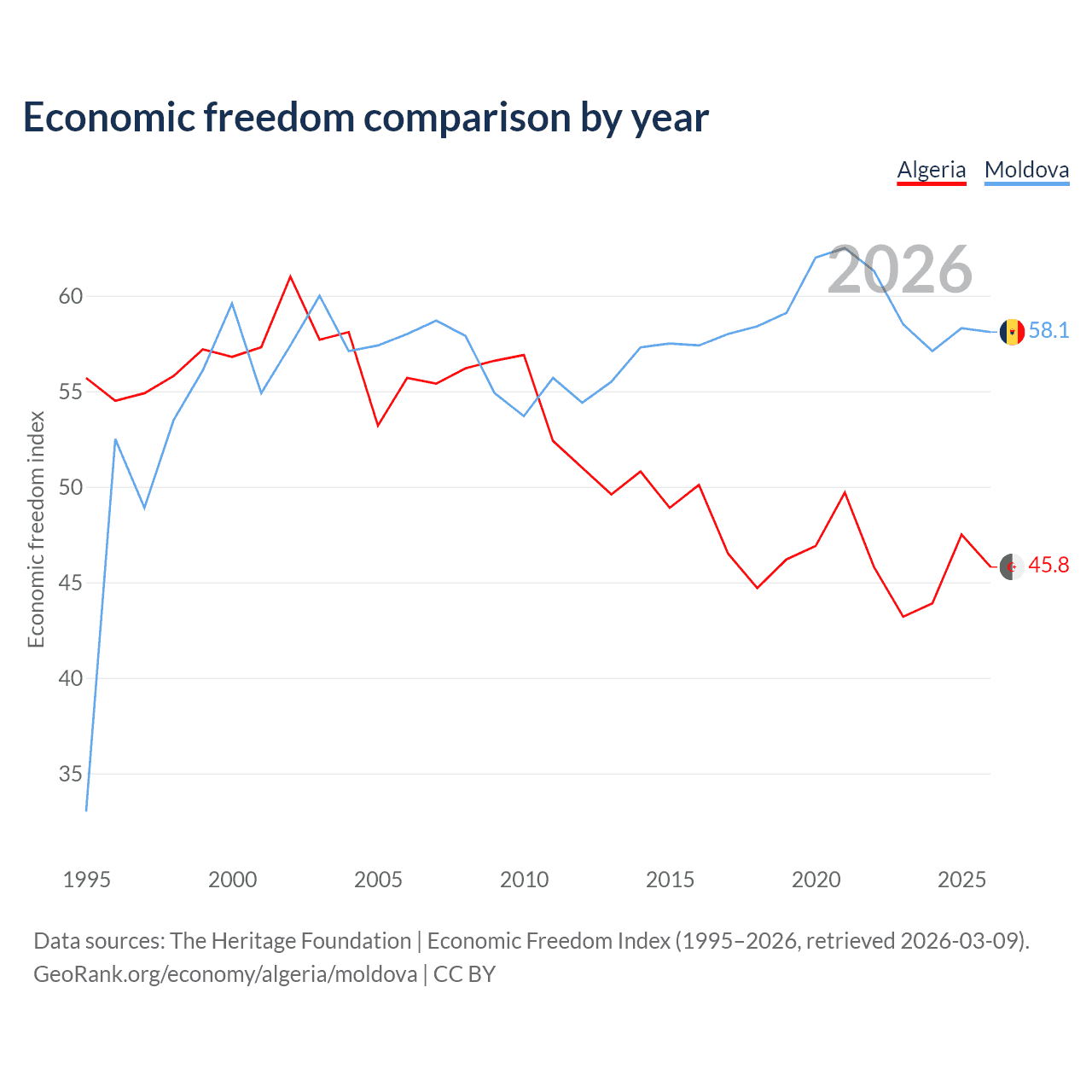 The Economic Freedom Index for Algeria is 45.8, ranking 179/197, compared to 58.1 for Moldova, ranking 112/197. The chart above displays a comparison of annual changes in economic freedom indexes.