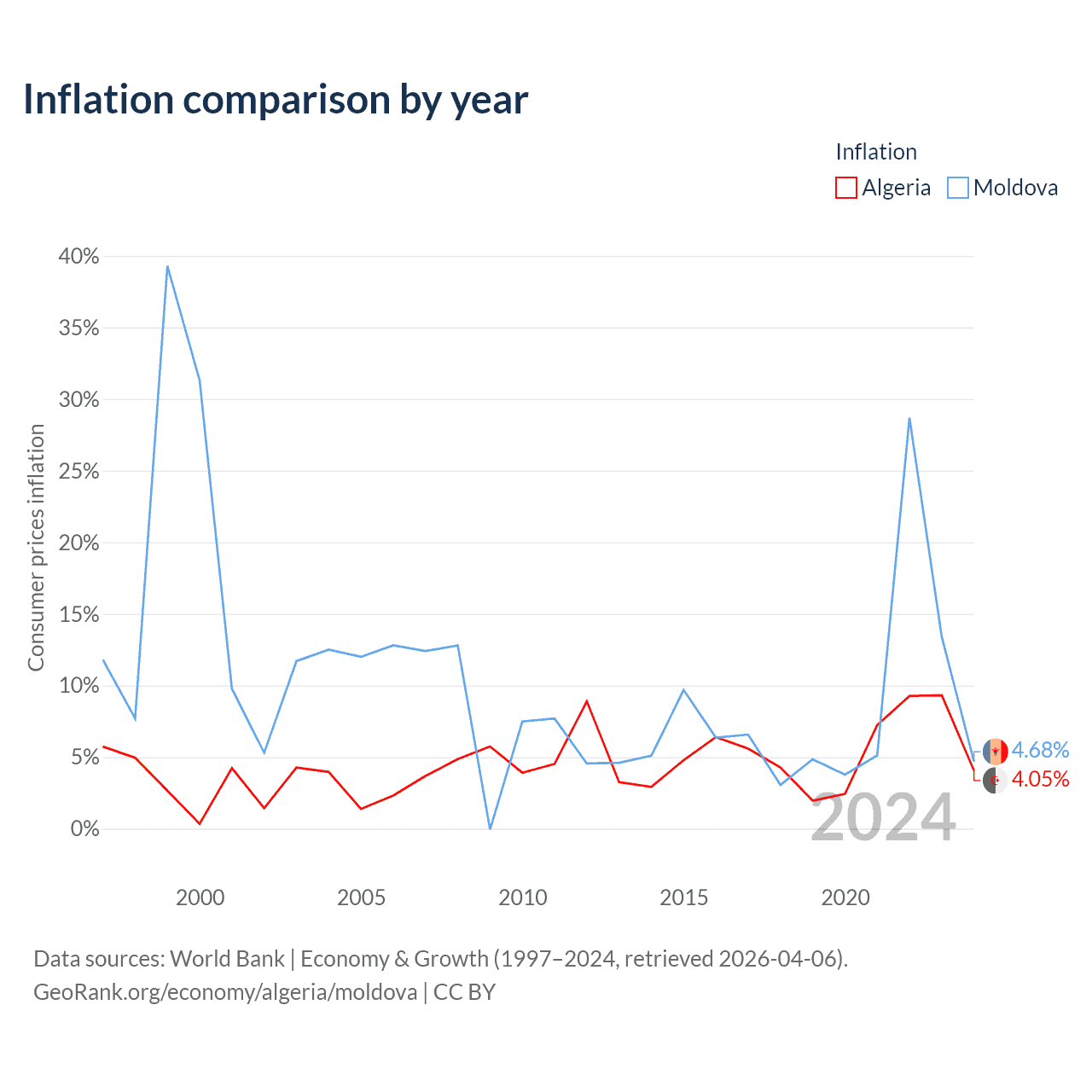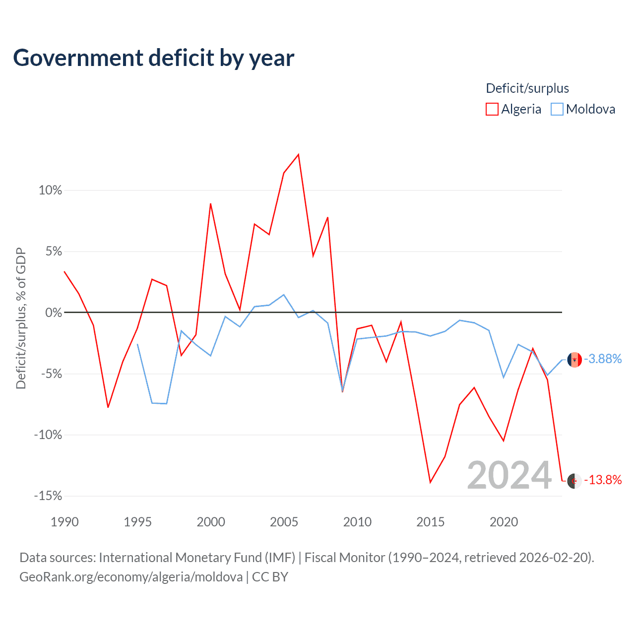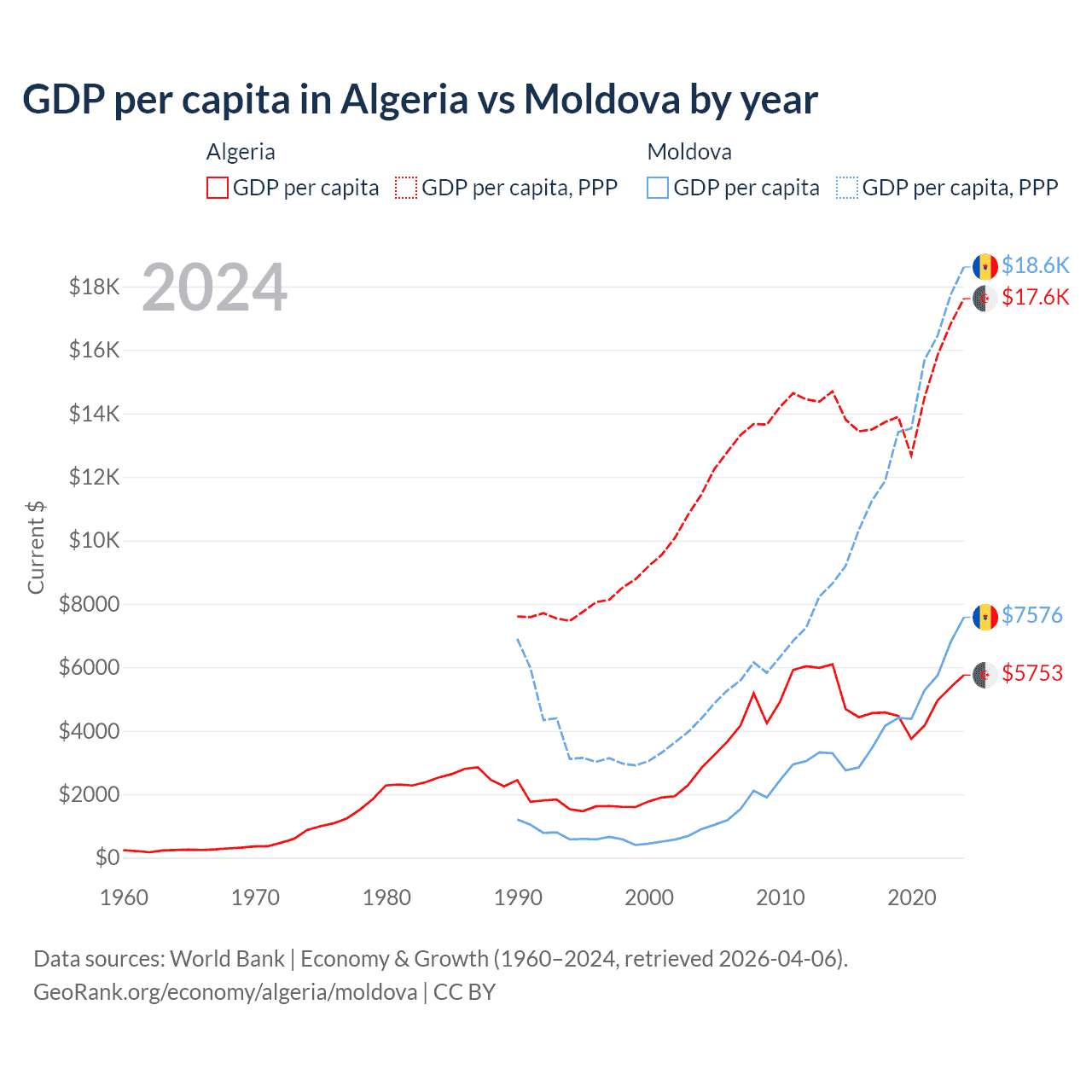 Algeria has a GDP of $269B compared to $18.2B for Moldova, ranking 51/197 and 134/197 by economy size, respectively.
