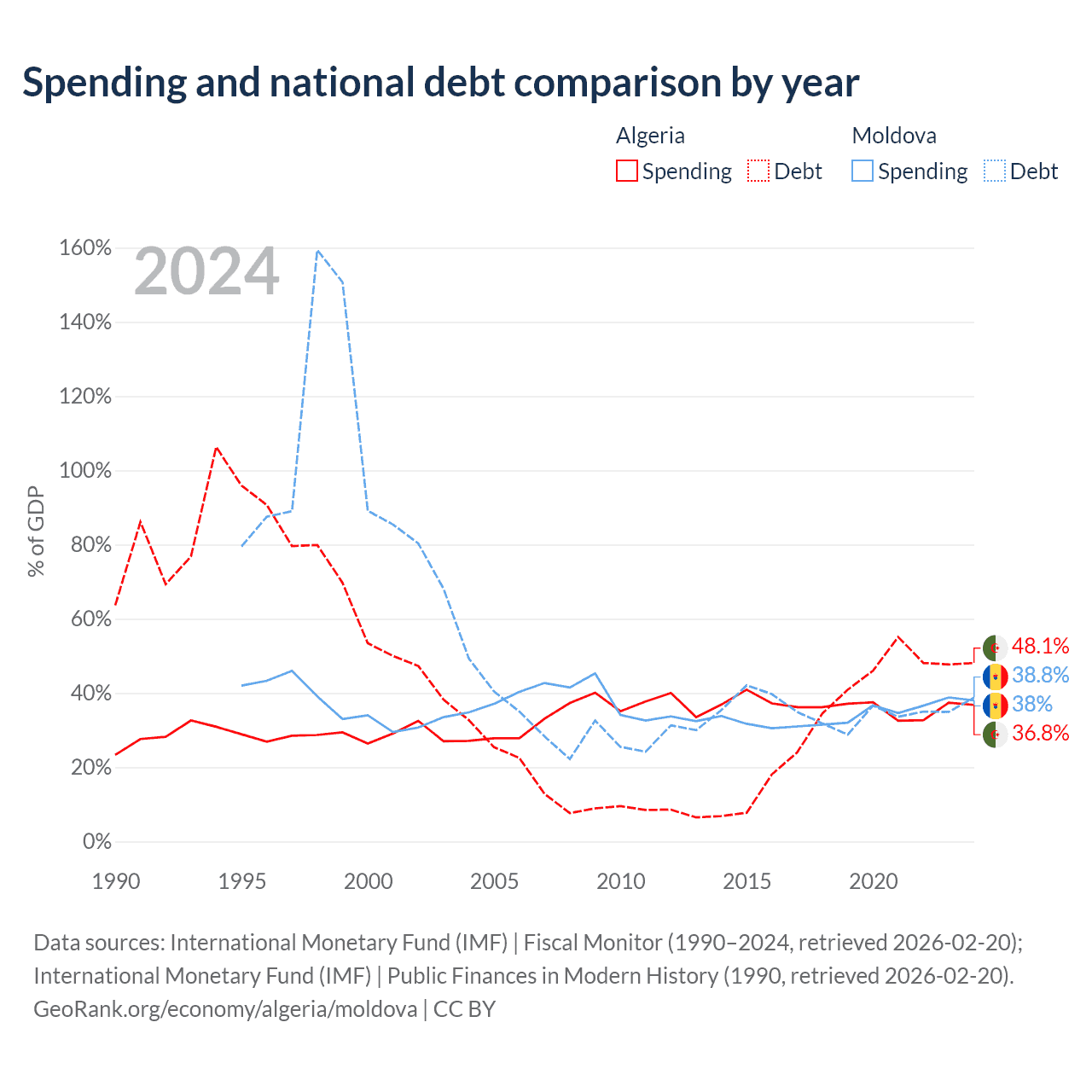 Algeria has $129B in government debt (48.1% of GDP), compared to $7.06B (38.8% of GDP) in Moldova.