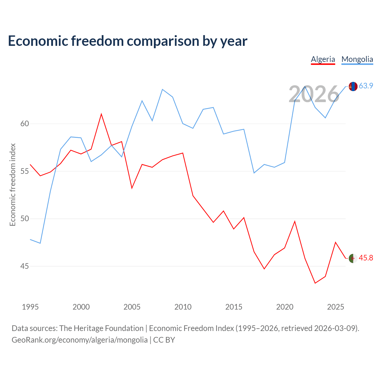 The Economic Freedom Index for Algeria is 45.8, ranking 179/197, compared to 63.9 for Mongolia, ranking 76/197. The chart above displays a comparison of annual changes in economic freedom indexes.