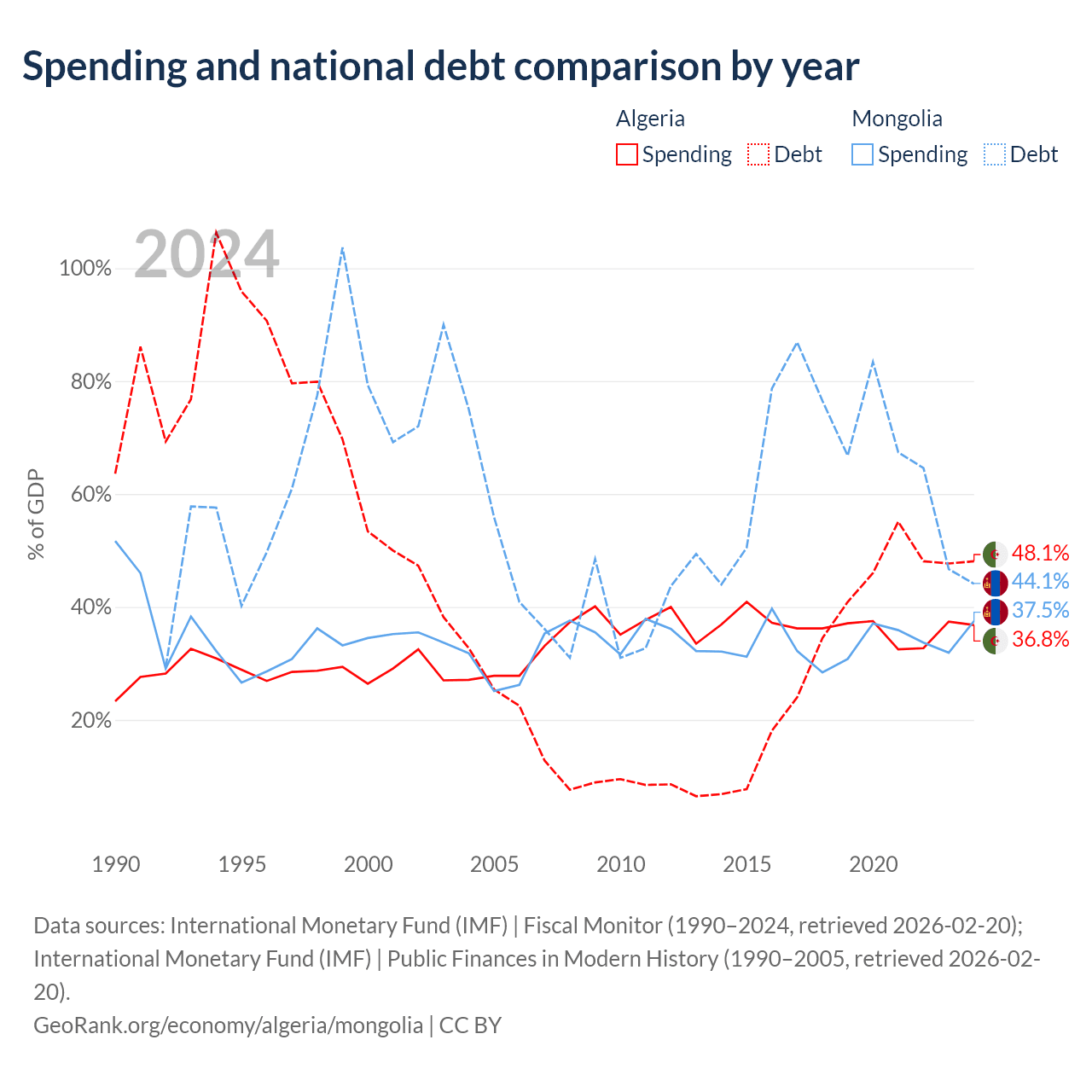 Algeria has $129B in government debt (48.1% of GDP), compared to $10.5B (44.1% of GDP) in Mongolia.