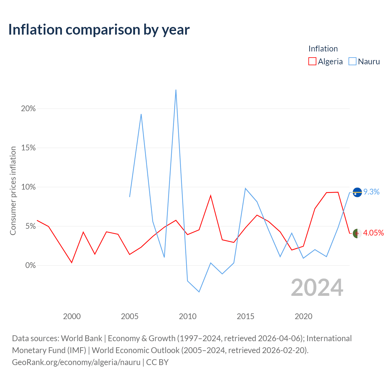 Over the past 20 years, Algeria has recorded an average annual inflation rate of 4.84%, compared with 4.84% in Nauru. In 2024, inflation was 4.05% in Algeria and 9.3% in Nauru.