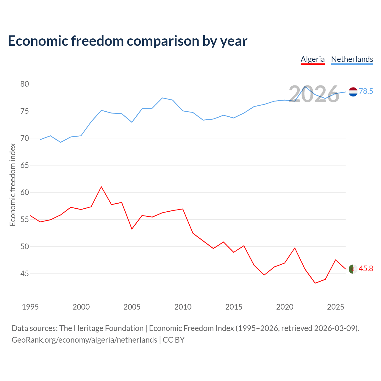 The Economic Freedom Index for Algeria is 45.8, ranking 179/197, compared to 78.5 for the Netherlands, ranking 11/197. The chart above displays a comparison of annual changes in economic freedom indexes.