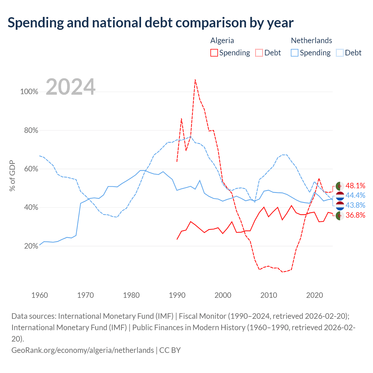 Algeria has $129B in government debt (48.1% of GDP), compared to $532B (43.8% of GDP) in the Netherlands.