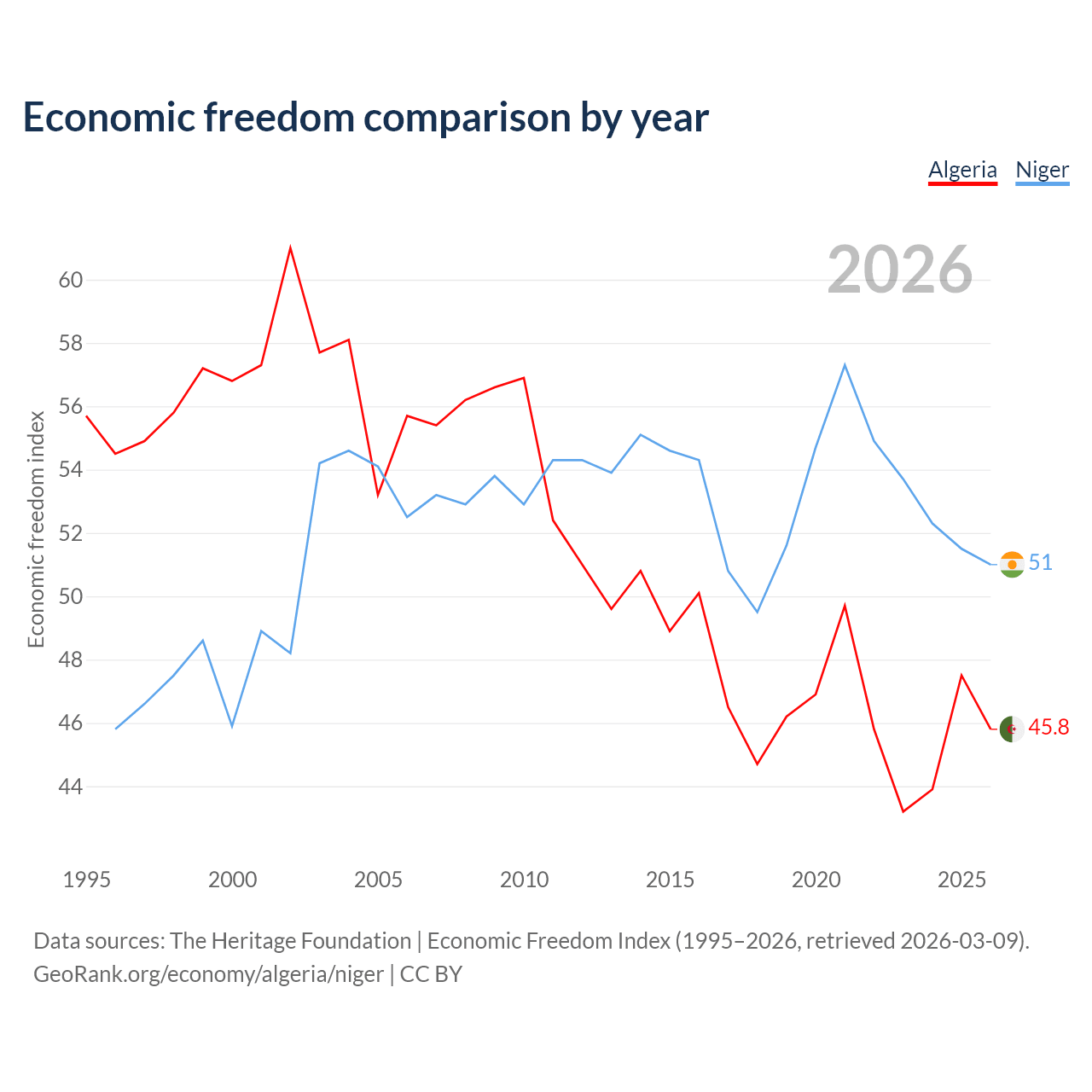 The Economic Freedom Index for Algeria is 45.8, ranking 179/197, compared to 51 for Niger, ranking 156/197. The chart above displays a comparison of annual changes in economic freedom indexes.