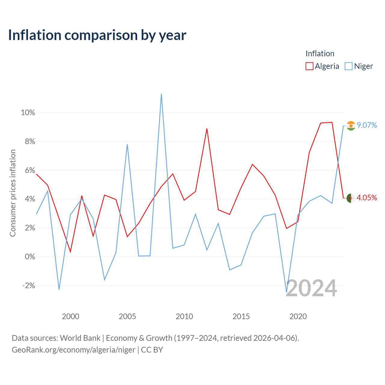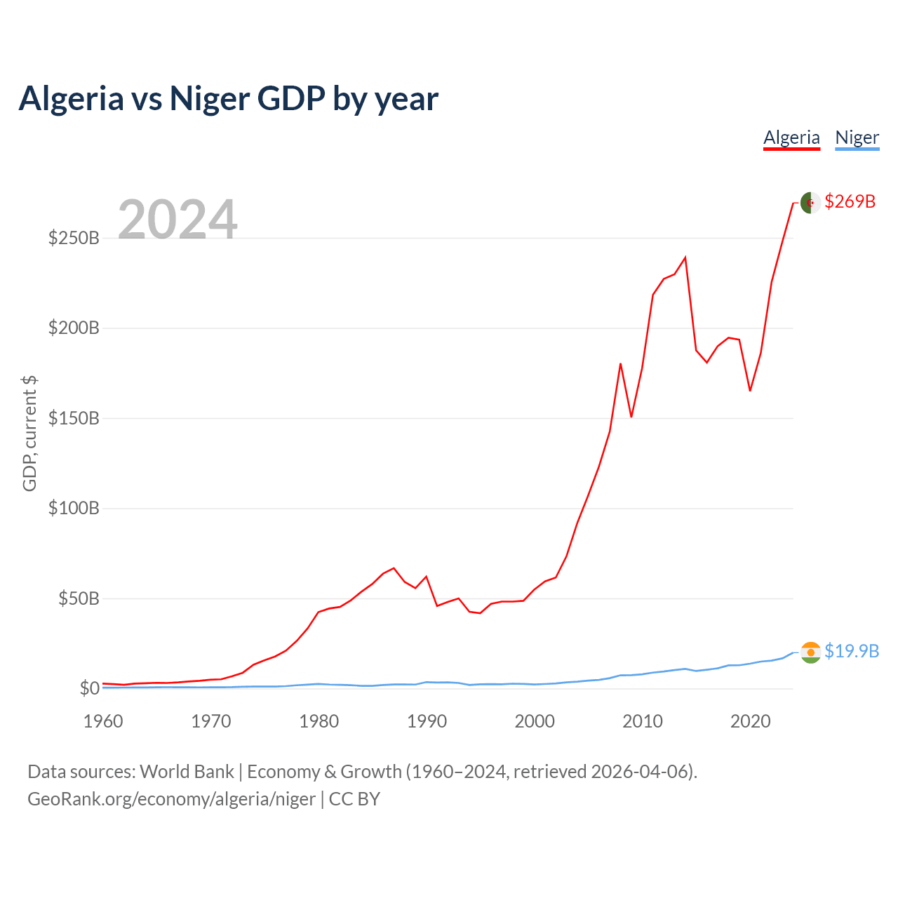 Algeria has a GDP of $269B compared to $19.9B for Niger, ranking 51/197 and 130/197 by economy size, respectively.