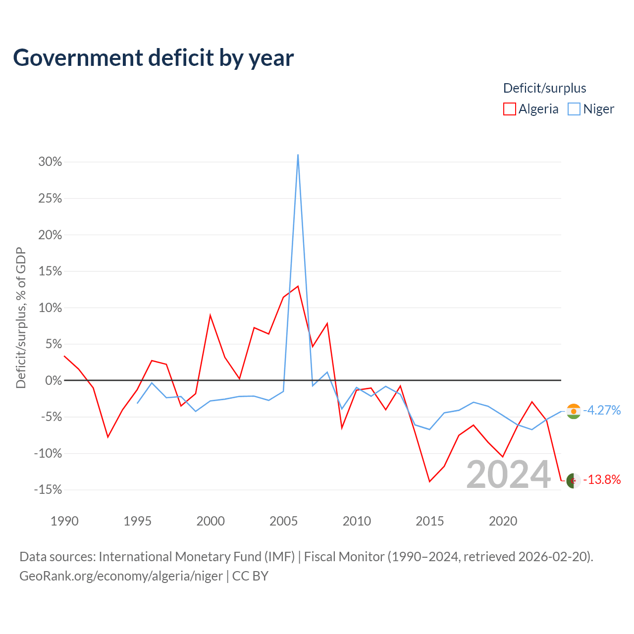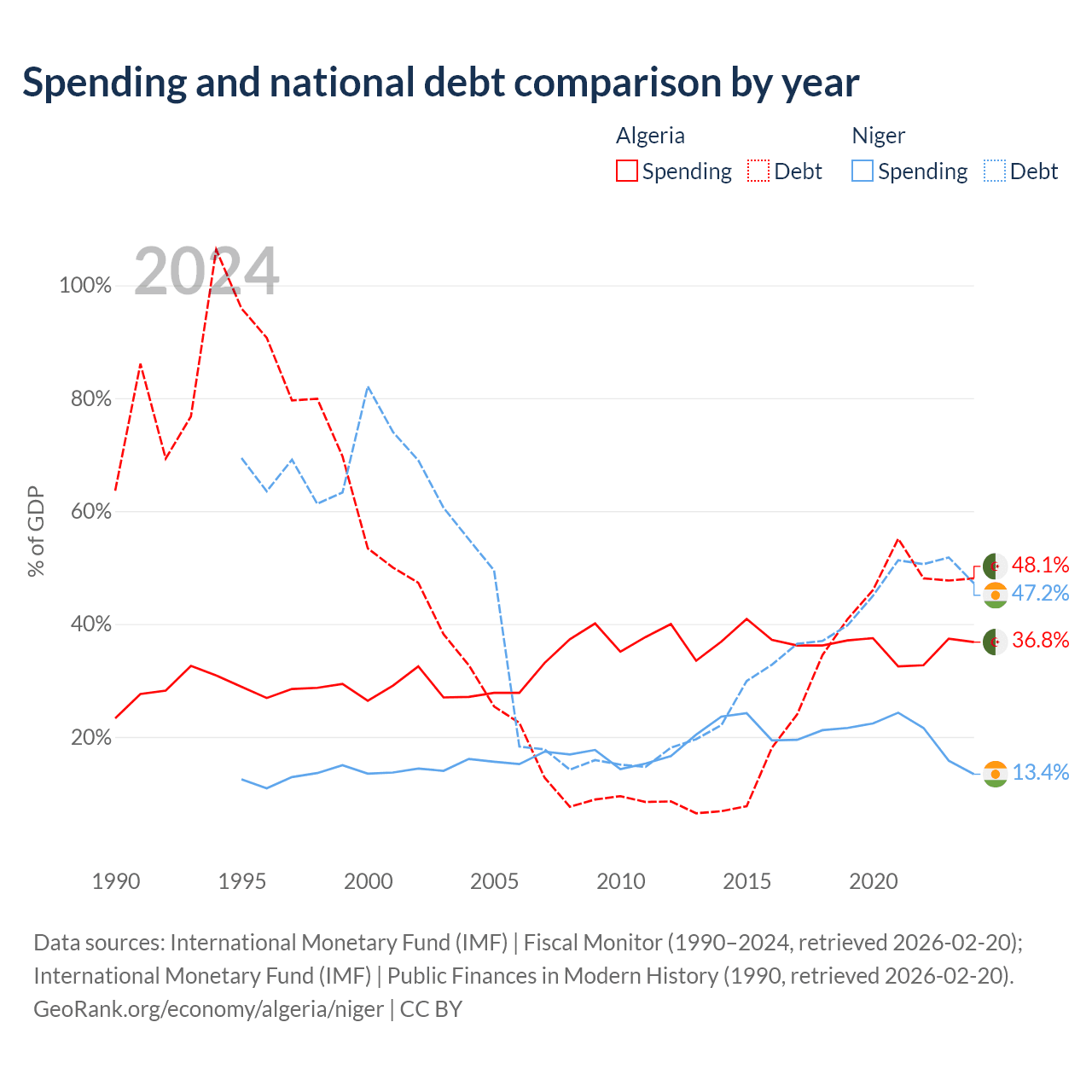 Algeria has $129B in government debt (48.1% of GDP), compared to $9.39B (47.2% of GDP) in Niger.