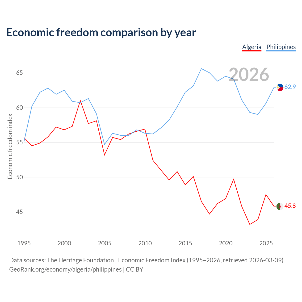 The Economic Freedom Index for Algeria is 45.8, ranking 179/197, compared to 62.9 for the Philippines, ranking 85/197. The chart above displays a comparison of annual changes in economic freedom indexes.