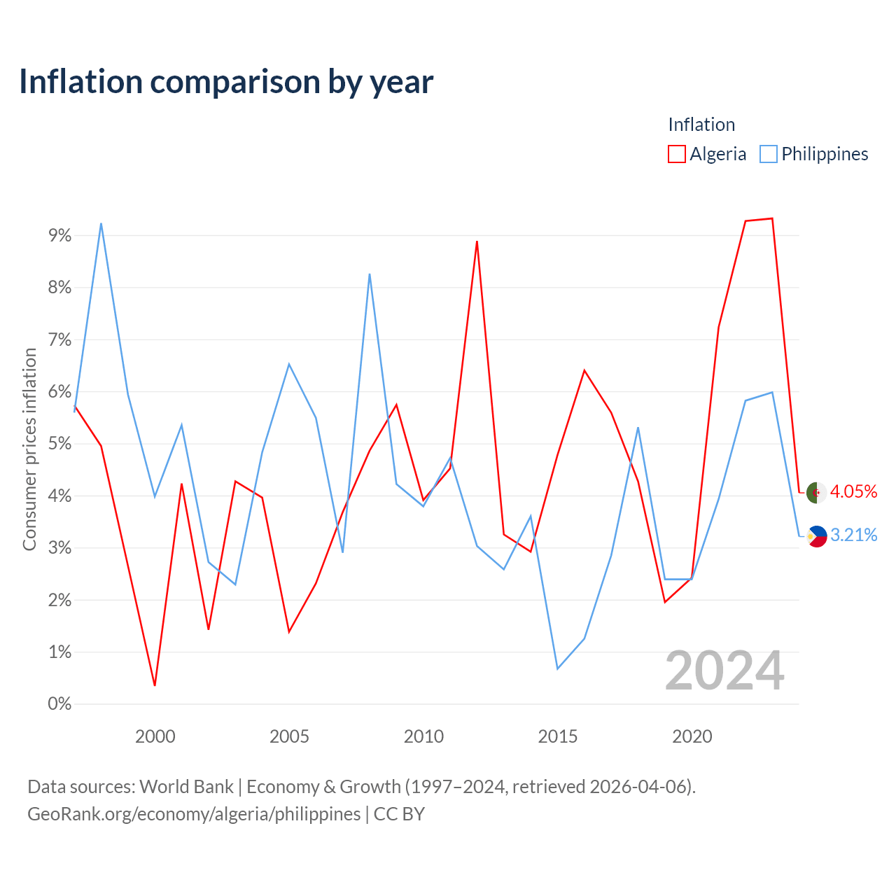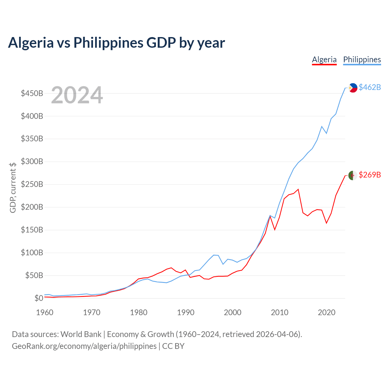 Algeria has a GDP of $269B compared to $462B for the Philippines, ranking 51/197 and 35/197 by economy size, respectively.