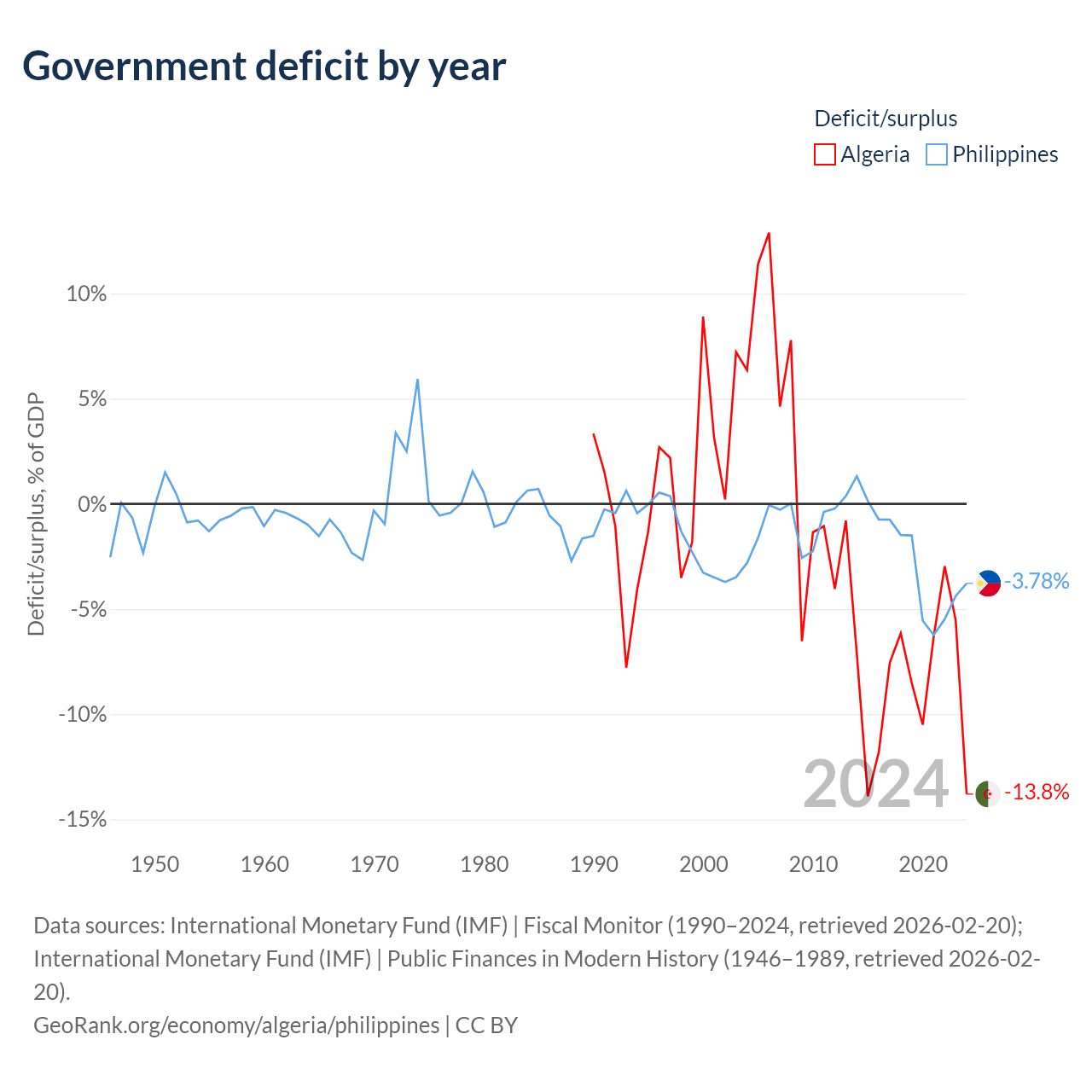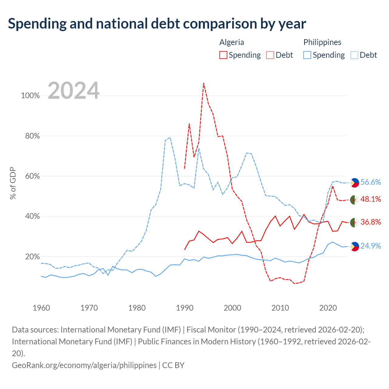 Algeria has $129B in government debt (48.1% of GDP), compared to $261B (56.6% of GDP) in the Philippines.