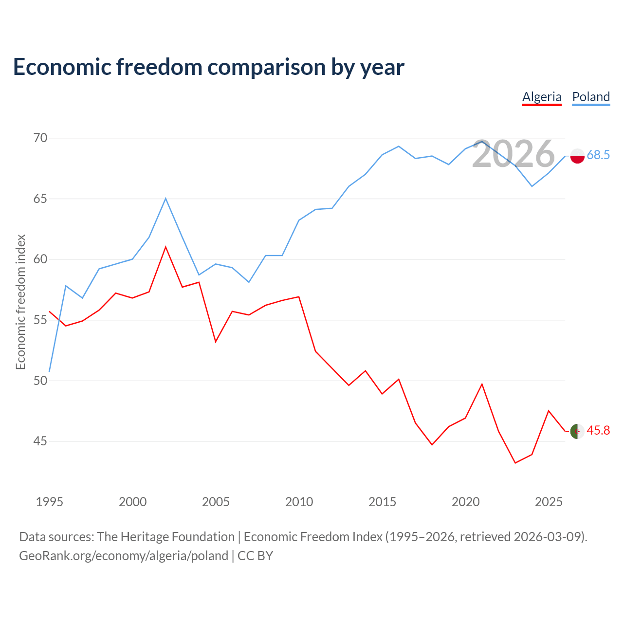 The Economic Freedom Index for Algeria is 45.8, ranking 179/197, compared to 68.5 for Poland, ranking 46/197. The chart above displays a comparison of annual changes in economic freedom indexes.