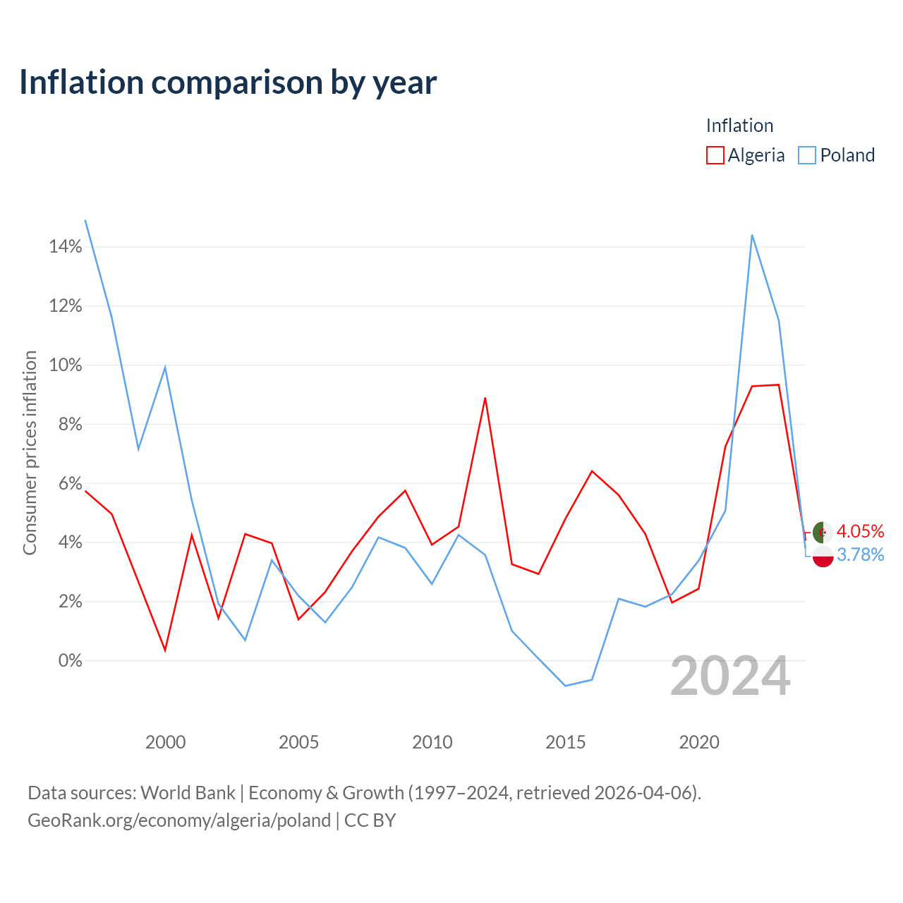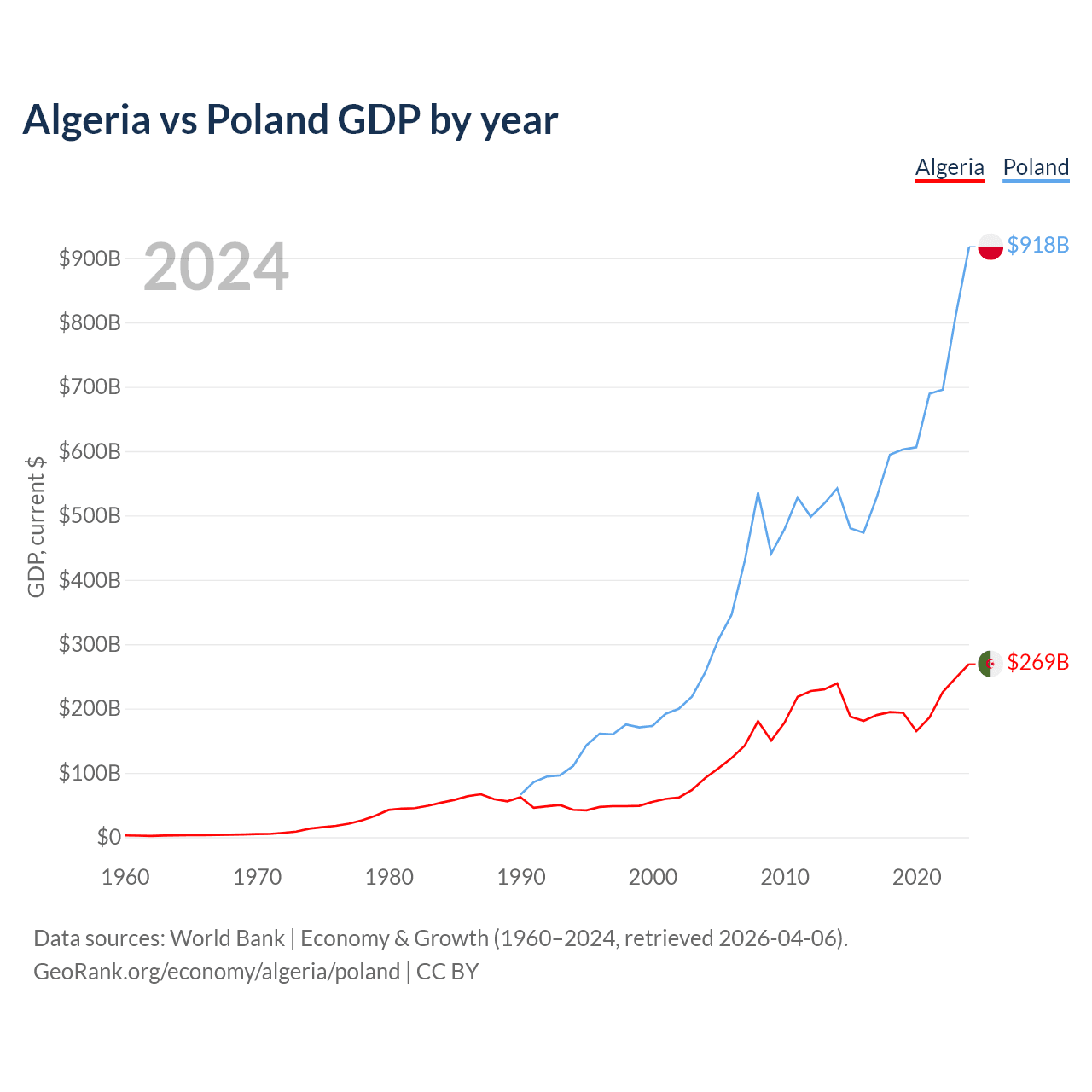 Algeria has a GDP of $269B compared to $918B for Poland, ranking 51/197 and 21/197 by economy size, respectively.