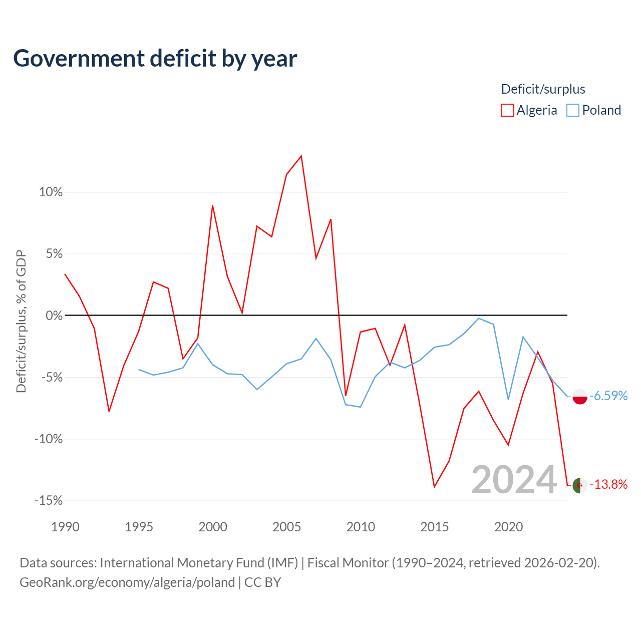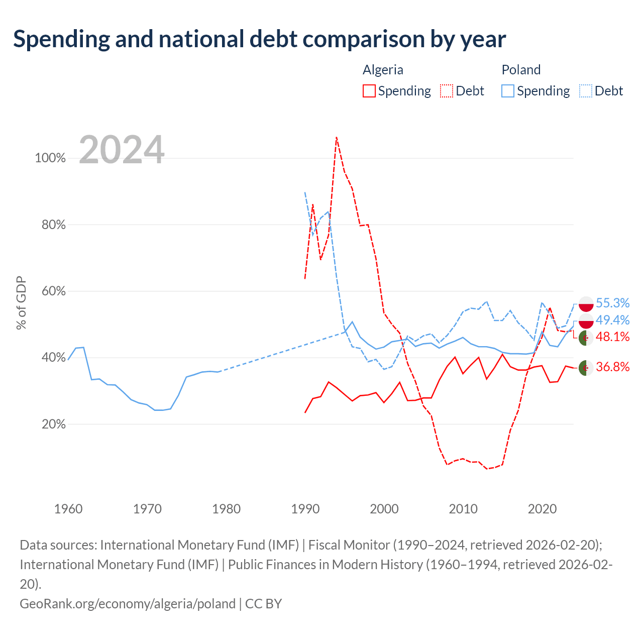 Algeria has $129B in government debt (48.1% of GDP), compared to $507B (55.3% of GDP) in Poland.