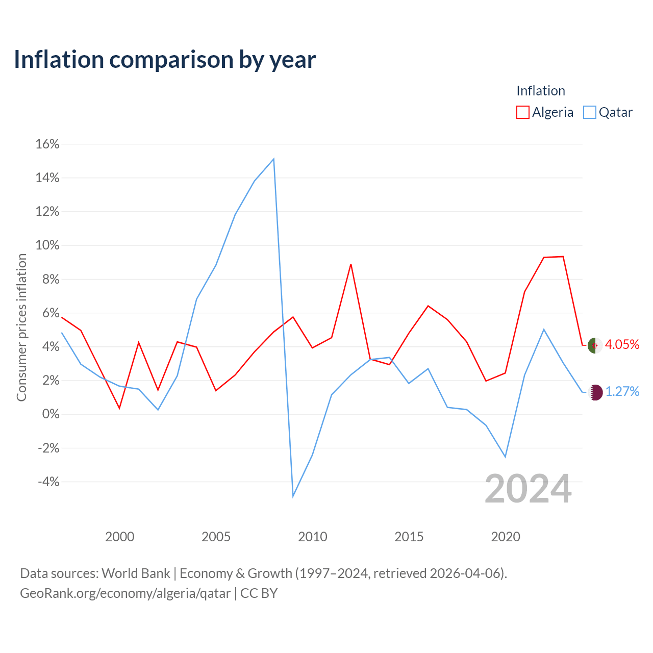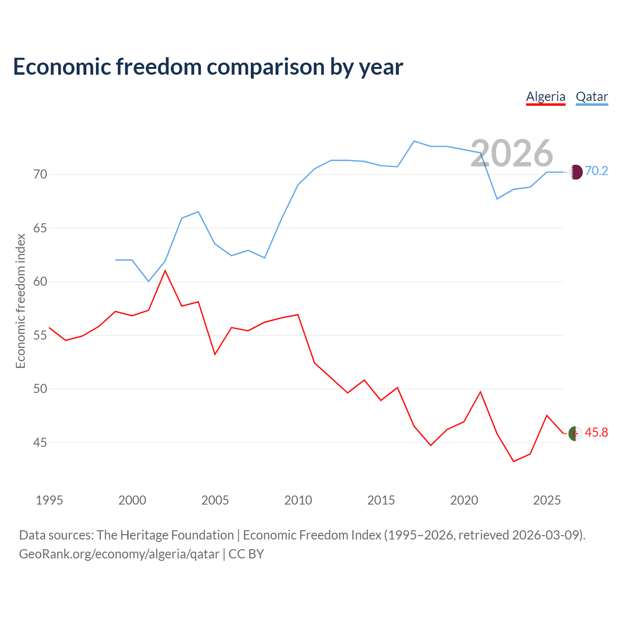 The Economic Freedom Index for Algeria is 45.8, ranking 179/197, compared to 70.2 for Qatar, ranking 37/197. The chart above displays a comparison of annual changes in economic freedom indexes.