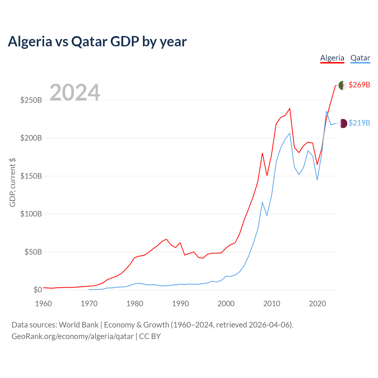 Algeria has a GDP of $269B compared to $219B for Qatar, ranking 51/197 and 56/197 by economy size, respectively.