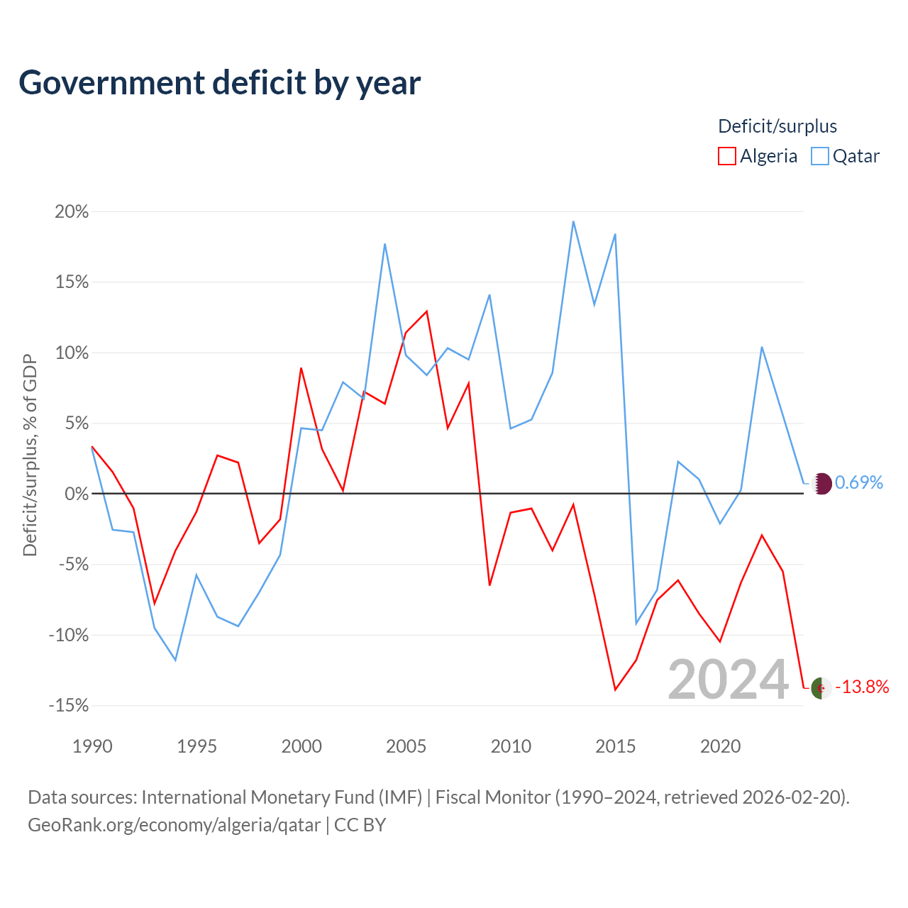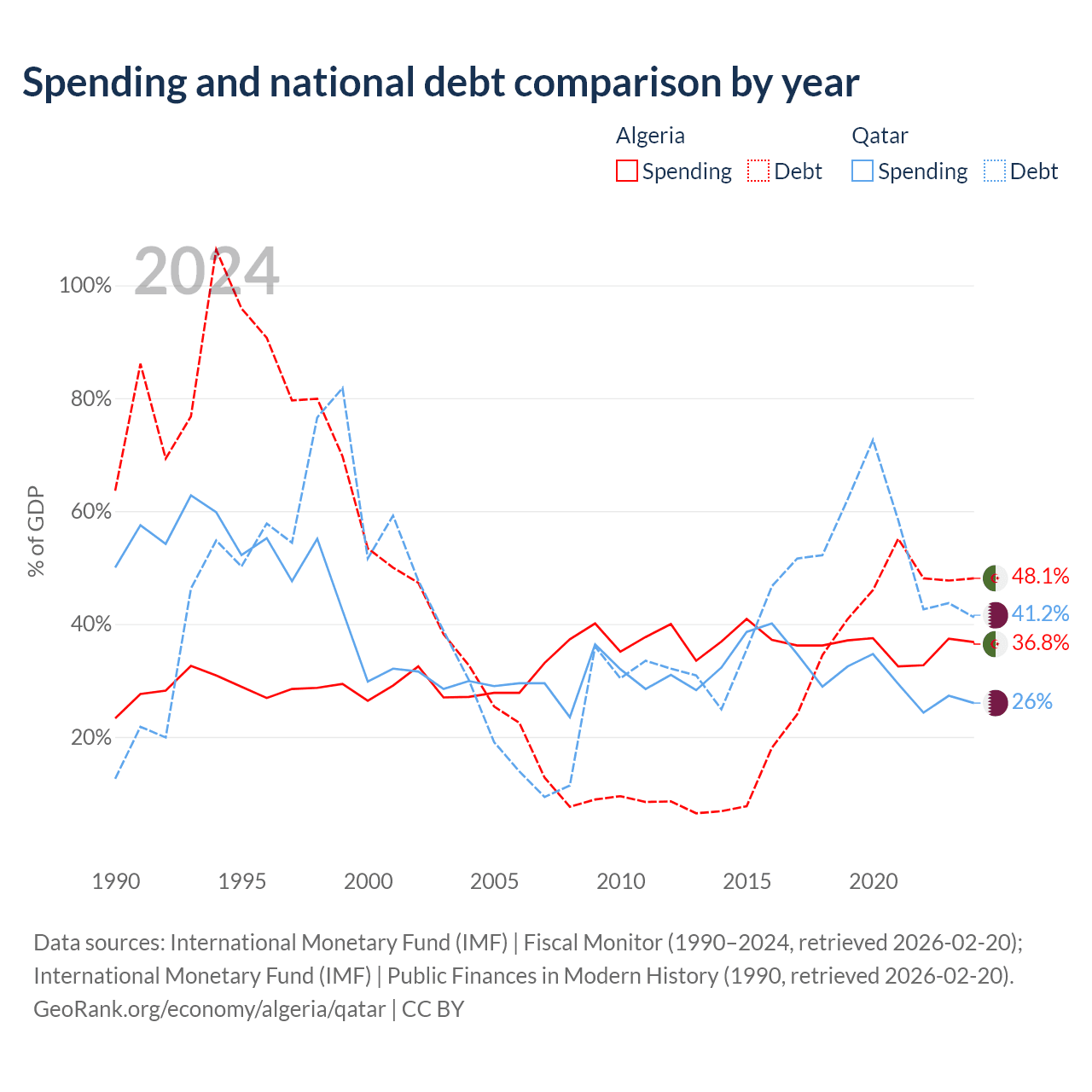 Algeria has $129B in government debt (48.1% of GDP), compared to $90.2B (41.2% of GDP) in Qatar.