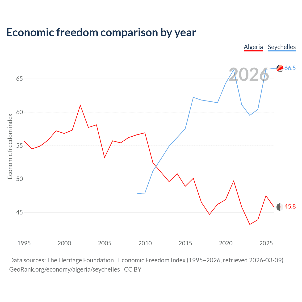 The Economic Freedom Index for Algeria is 45.8, ranking 179/197, compared to 66.5 for the Seychelles, ranking 60/197. The chart above displays a comparison of annual changes in economic freedom indexes.