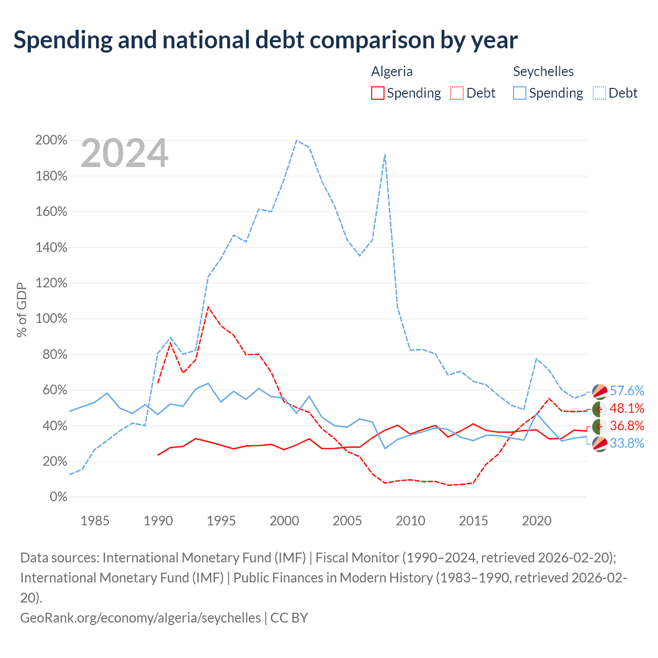 Algeria has $129B in government debt (48.1% of GDP), compared to $1.25B (57.6% of GDP) in the Seychelles.