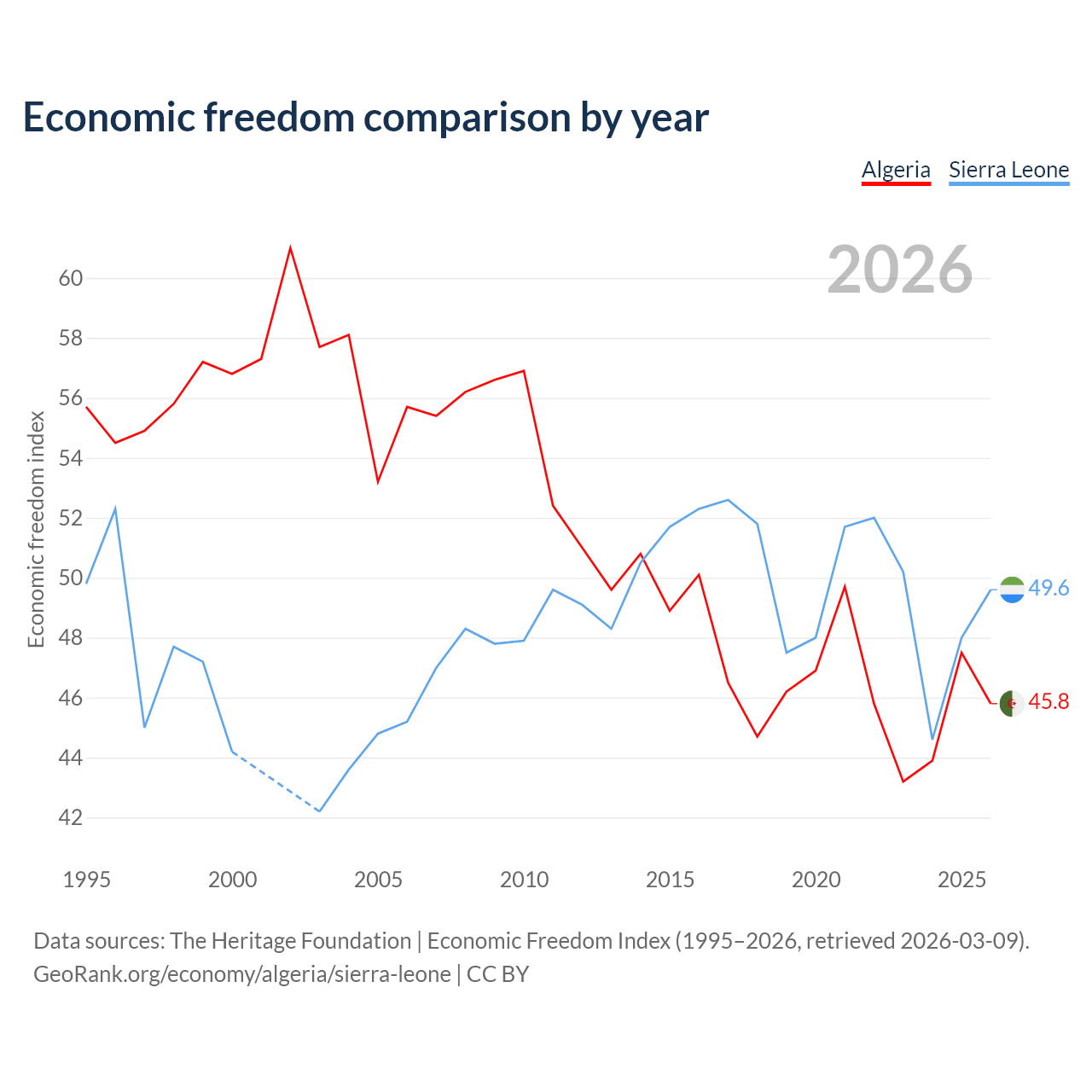 The Economic Freedom Index for Algeria is 45.8, ranking 179/197, compared to 49.6 for Sierra Leone, ranking 165/197. The chart above displays a comparison of annual changes in economic freedom indexes.
