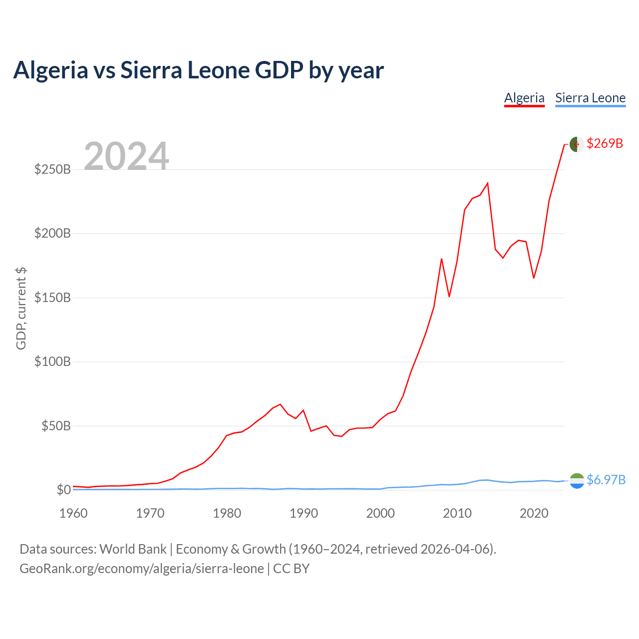 Algeria has a GDP of $269B compared to $6.97B for Sierra Leone, ranking 51/197 and 160/197 by economy size, respectively.