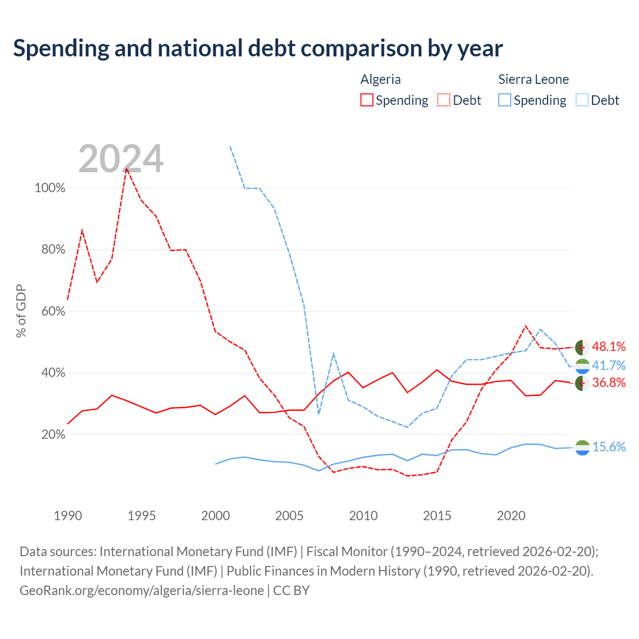 Algeria has $129B in government debt (48.1% of GDP), compared to $2.91B (41.7% of GDP) in Sierra Leone.