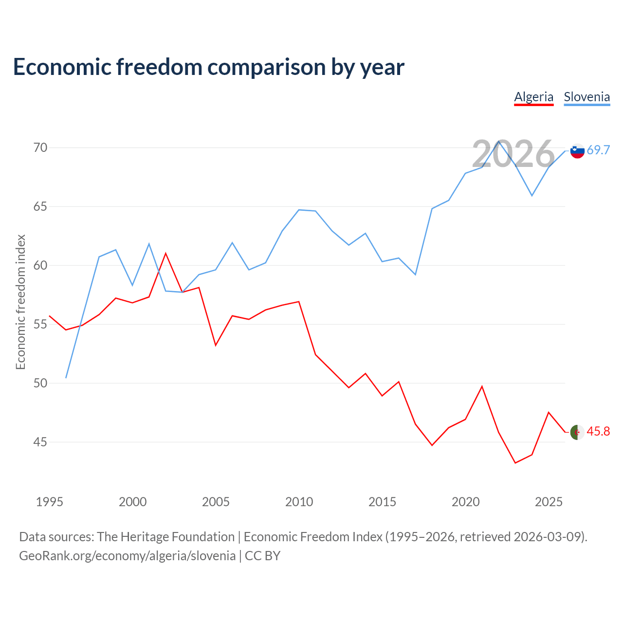 The Economic Freedom Index for Algeria is 45.8, ranking 179/197, compared to 69.7 for Slovenia, ranking 40/197. The chart above displays a comparison of annual changes in economic freedom indexes.